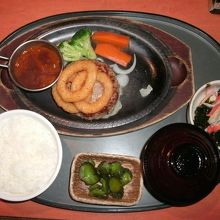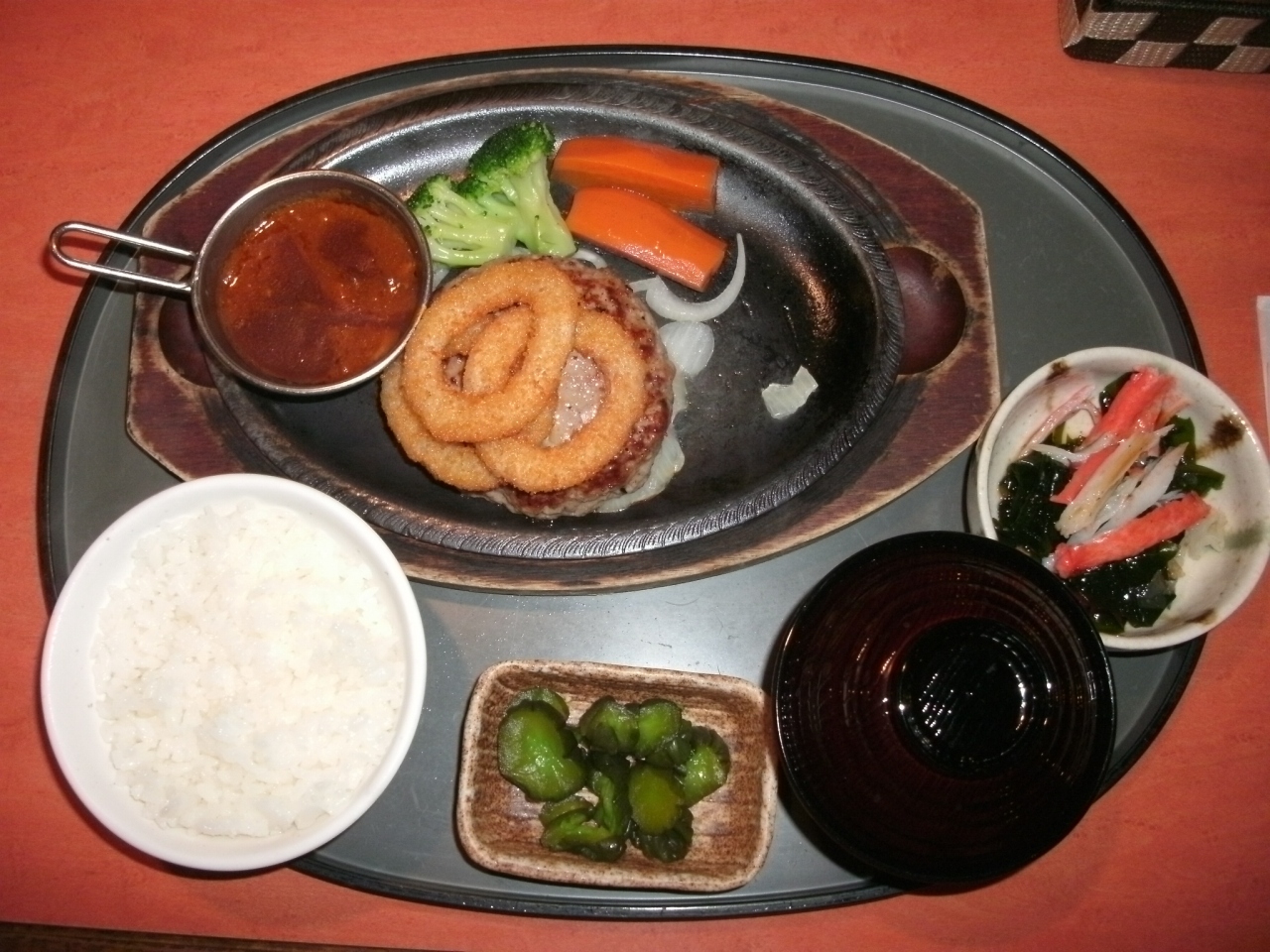 初めて訪れたお店だったので、よくわからないままハンバーグとご飯のセットをオーダーしたら、『定食のほうが、同じ内容でお得ですよ』とスタッフの方が丁寧にに説明してくれました。“ハンバーグ定食 1210円”は、ハンバーグと小鉢、味噌汁、香の物、ご飯がセットになったもので、ハンバーグは、ジューシーで、ハンバーグに乗せられたオニオンリングがサクッとした良いアクセントになっていて美味しかったです。