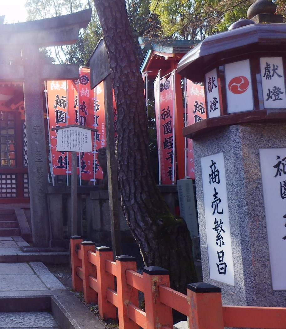 京都の八坂神社の境内南東側に鎮座されている北向蛭子社。えべっさんが八坂神社に祀られるようになったのは平安時代といわれており全国のえべっさんの中でも歴史が長い、社殿が北向きに建てられているので北向蛭子社と呼ばれている 、参考資料+八坂神社が現地に設置した説明板