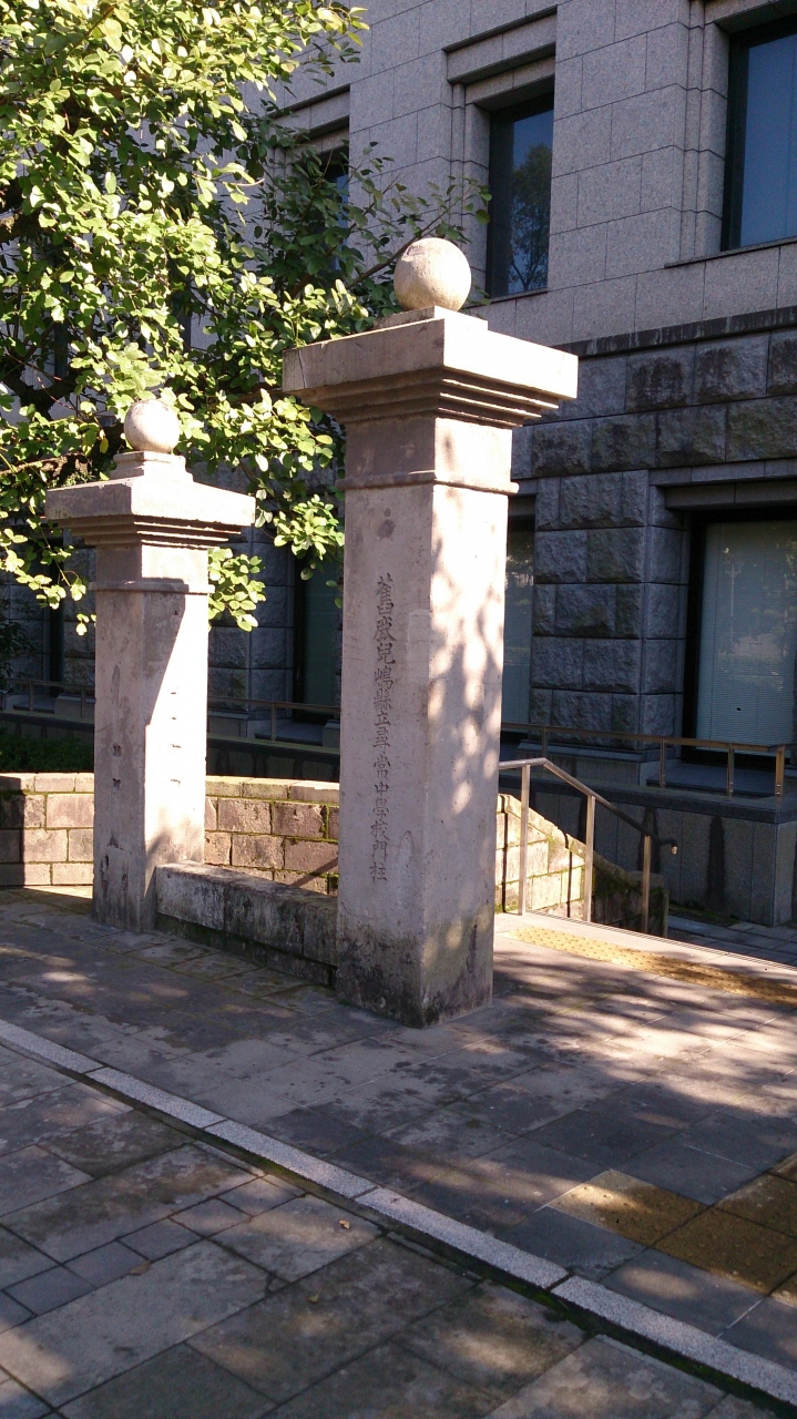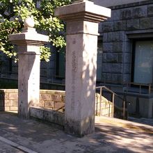 かごしま県民交流センターの国道10号線側にあって、現在も交流センターの西玄関の門の一部として利用されていて、交流センターが先進的なデザインの建物だけに、この門が歴史史跡だけに全くアンマッチな風景になっています。門自体は重厚感たっぷりの石柱が左右に2本づつあって、最上部に丸い球体がのり、かなりの高さです。国の登録有形文化財だけに風格を強く感じます。この門柱がある場所は、私学校跡や西南戦争の銃弾跡、憲政記念館などの観光スポットが集中しているので場所なので、合わせて立ち寄る感じだと思います。