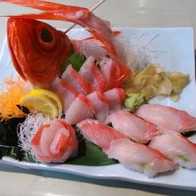 魚市場、しかも海のそばで魚どころ横須賀とあって魚料理が充実。寿司職人もいて、一貫から注文でき、天ぷらも種類がたくさんあったが、やはり食べたいのは刺身。海鮮丼やマグロも食べたかったが、このときはオゴリだったので、高めの金目のセットを注文。