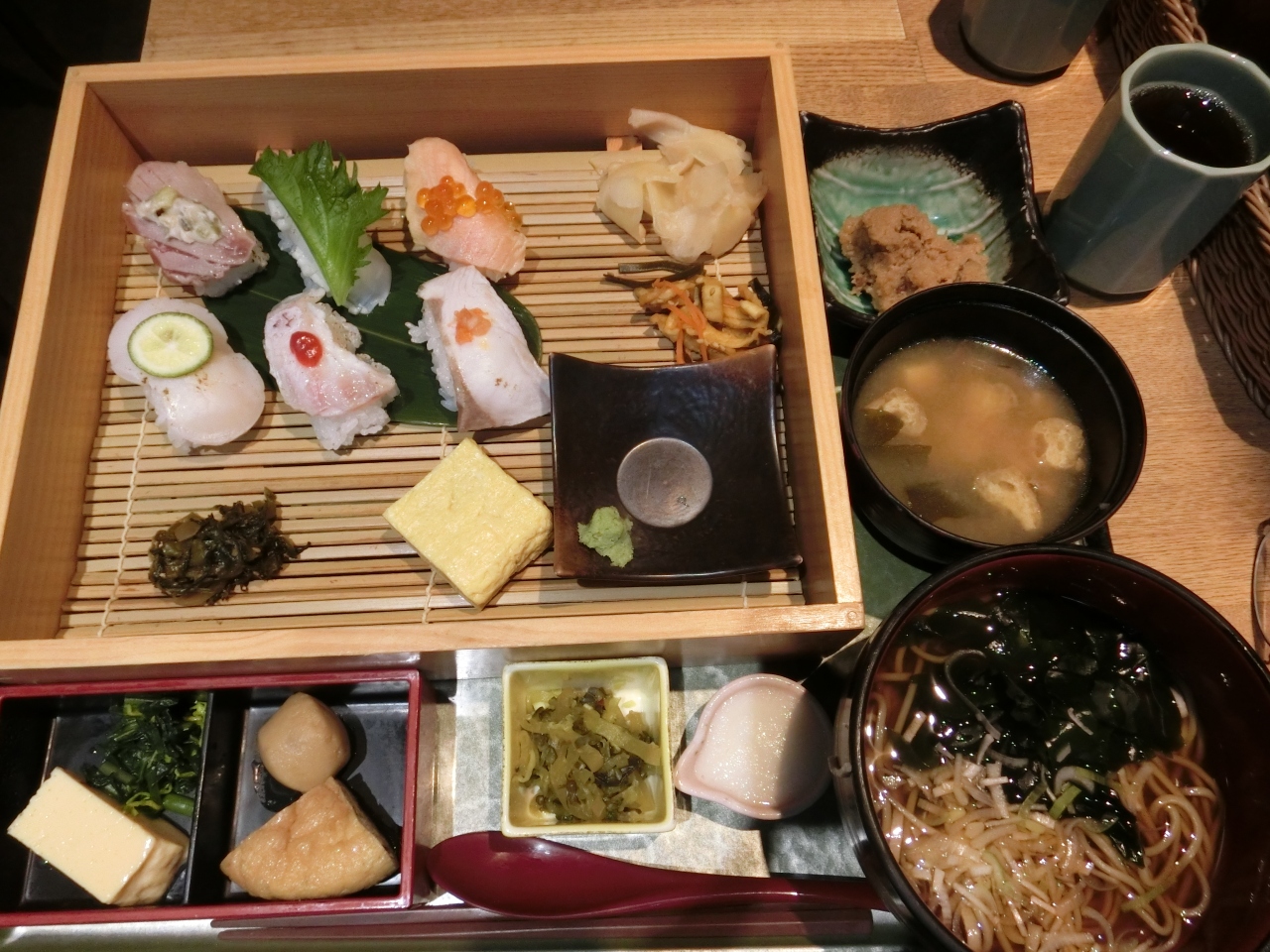 季節の六種の炙り寿司とへぎそばのミニを注文しました。