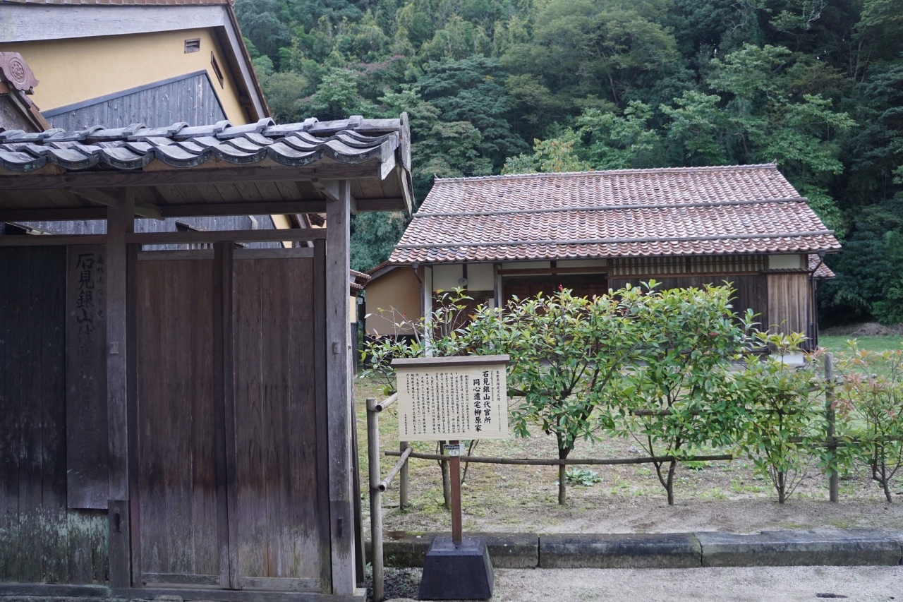 柳原家は、「石見銀山代官所の同心遺宅柳原家」と書いた説明板が生垣の前にありました。生垣の向こうは公園のようなスペースになっていて、遺宅はその奥にちょこっとある建物なんでしょうか。大森の武家屋敷は表から二階が見えない造りだとか説明もありましたが、生垣から奥には行けそうにないので、よく分からないままにそこから辺りを眺めただけでした。