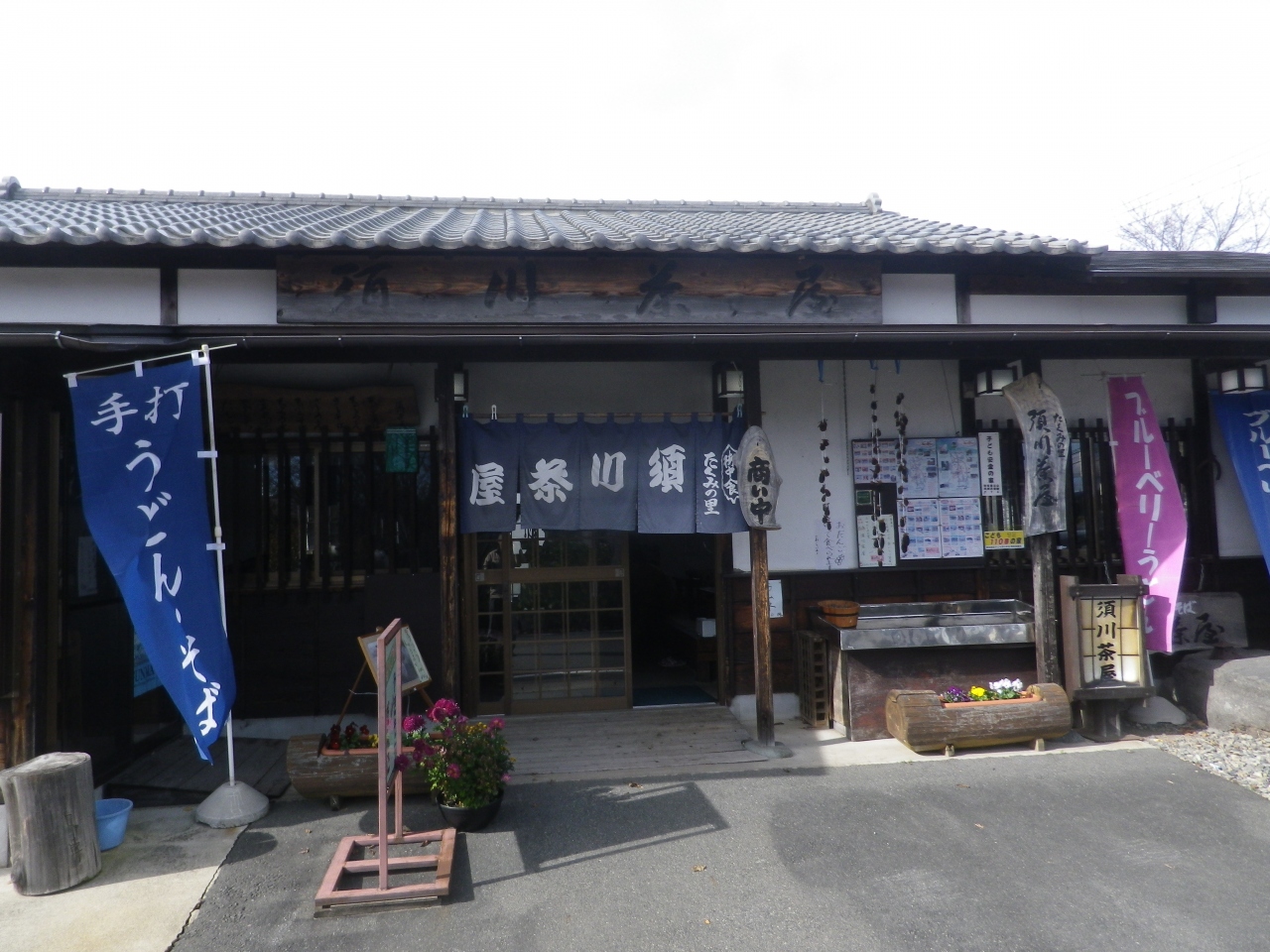 みなかみ町の旧新治村、旧三国街道須川宿にあるたくみの里、たくみの里の寺通りにあるのが須川茶屋、たくみの里では最も古い食事何処で、地元産の食材を使った料理が人気があるようです、店内には地元の野菜を使った茶屋まんじゅうが販売されていました、お店の前には野仏5番があります。