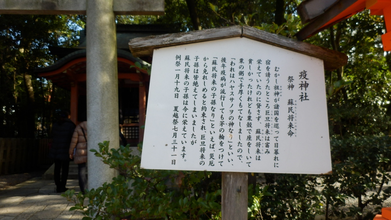 京都の八坂神社境内にある末社の一つ疫神社(蘇民将来社とも称する)西楼門を入りすぐ前鎮座されています、この神社の由緒は現地立札に記載されていたので別添写真参考にしてください、7月31日に夏越え祭として茅の輪くぐりが行われここをくぐって厄を払うため当日は沢山の参詣人がおとづれています、