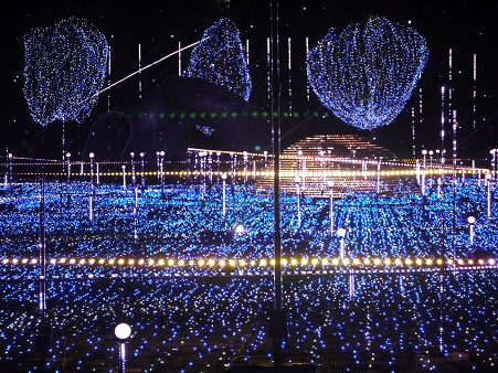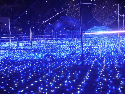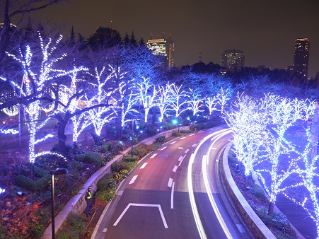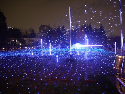 東京ミッドタウンの真向かいにある芝生広場で毎年恒例のイルミネーション「スターライトガーデン2015」が今年も11月12日から開催されています。52万個のLED電球の内18万個以上が輝く青色が中心の構成になっています。メイン会場以外でも見どころ充分です。