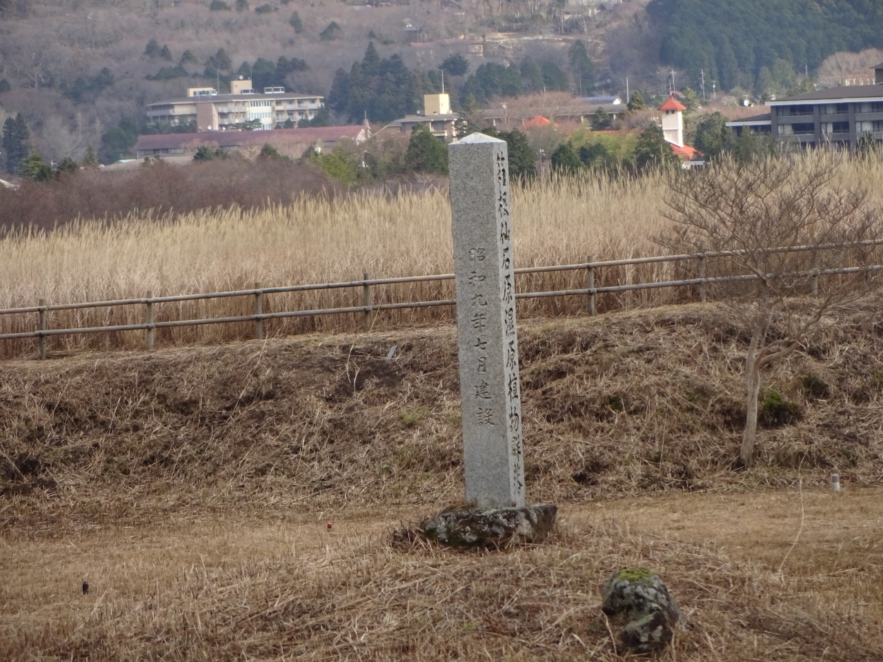 そのために珍しい植物があるそうですが、私が尋ねた今回、見たのは冬枯れのススキの中に立つ、石柱のみ。