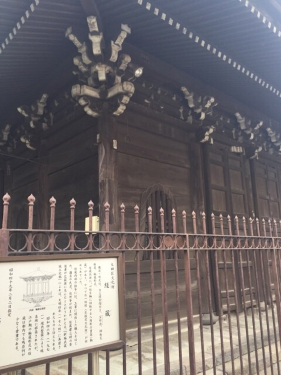 歴史は1784年に建てられたもので、経蔵内部の柱には江戸時代後期に江戸各地から参詣した人々の氏名が刻まれているそうです。