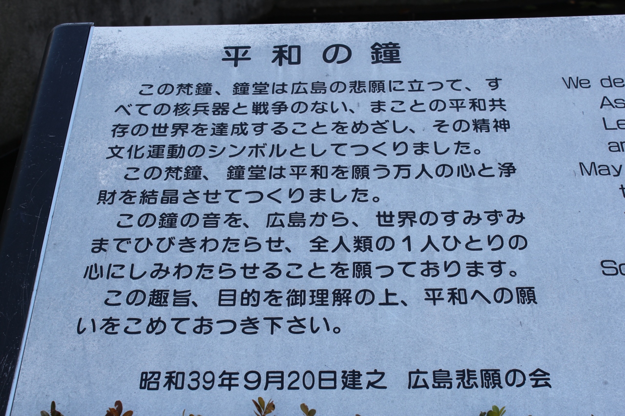 原爆ドームに行きました。行きは平和記念公園から元安橋を渡り原爆ドームの周りを観光した後、相生橋を渡り再び平和記念公園へ。平和の時計塔を見て少し行った所にありました。原爆で亡くなられた方々に哀悼の意をこめて鐘をつかせてもらいました。心に響く鐘でした