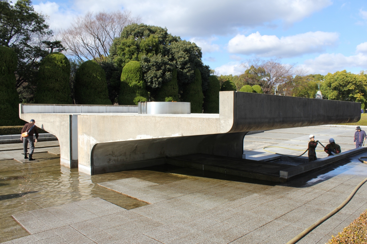 2015年の12月に広島旅行に行きました。平和記念公園に入り原爆死没者慰霊碑の隙間から原爆ドームを覗くと炎が見えました。平和の灯です。消防士さんが池の掃除をしていたので話しかけると「毎年、ハチテンロクの前と年末に消防士とボランティアの方で掃除をしてます」とのことでした。ハチテンロクとの言葉が重く響きました
