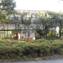 - ビルと鉄道の線路に挟まれ、モノレールが頭上を走っています