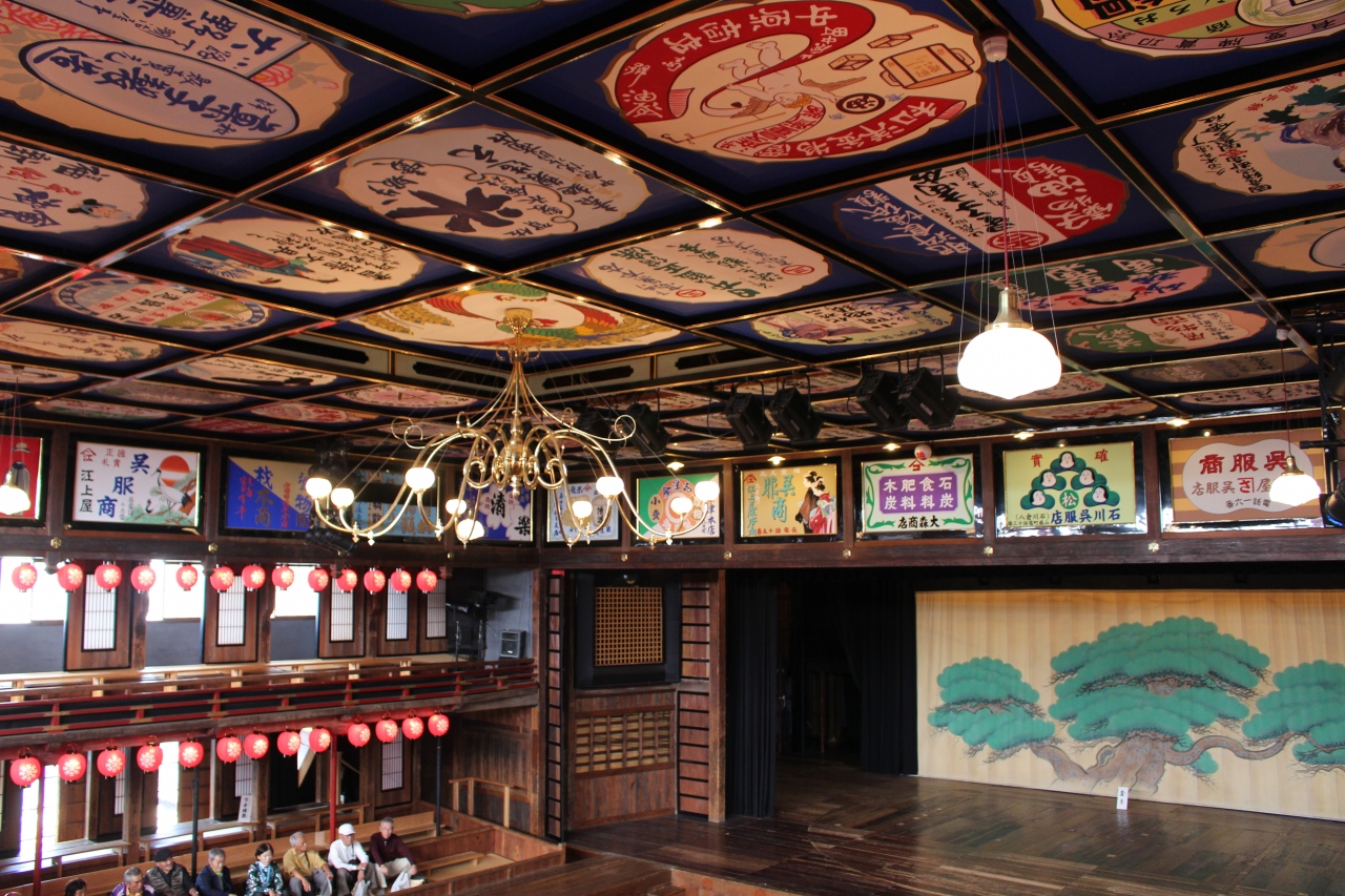 明治に建築された芝居小屋です。復元されたものらしいですが、今でも歌舞伎等の公演もやっています。入場料を払って見学しましたが、客席の天井にある広告が面白かったです。解説があるのですが、地元の店舗を含めてとても楽しかったです。