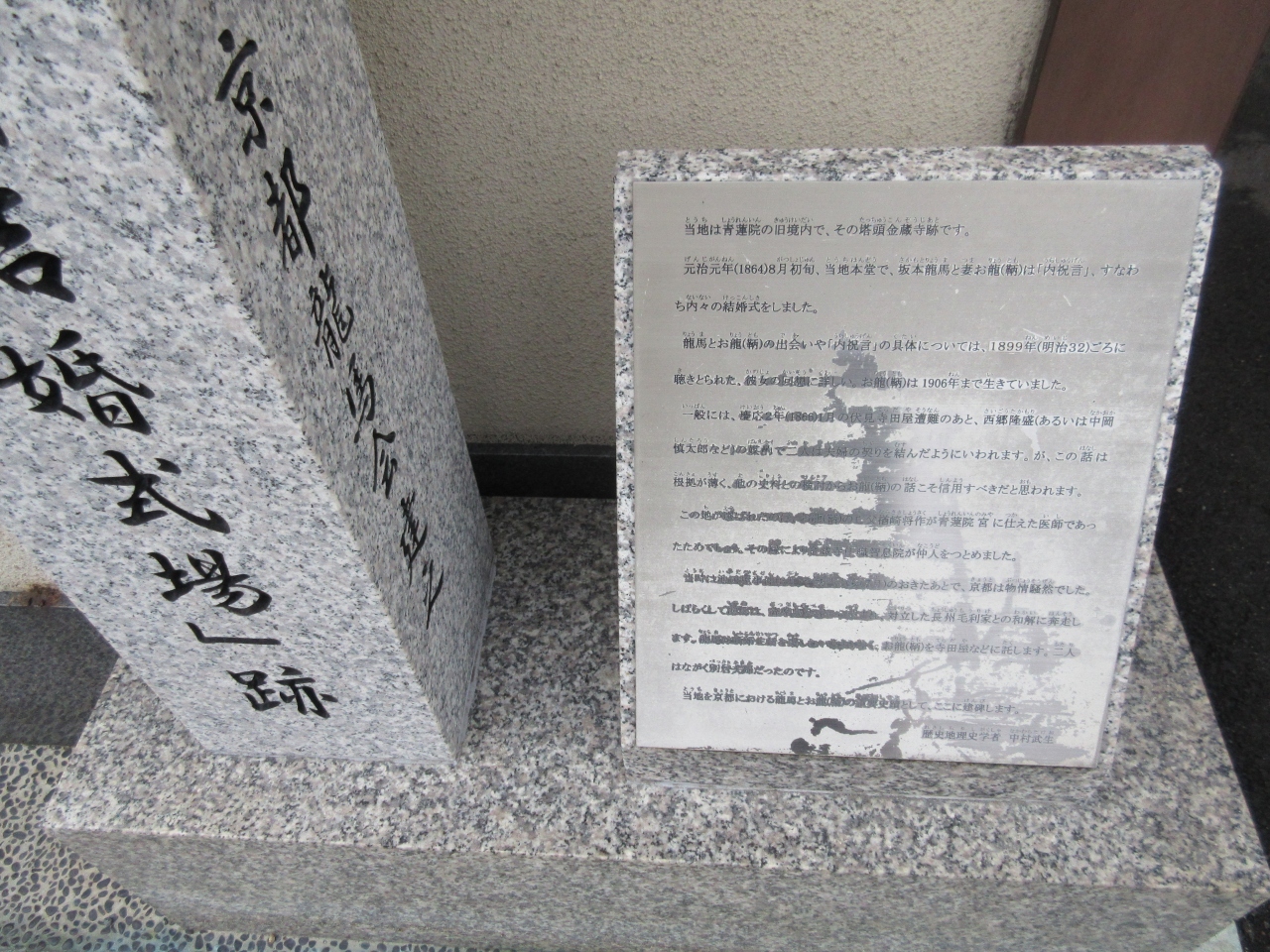 東山三条の交差点を東に行き、白川を渡ったすぐのところに、新しい石碑がありました。「坂本龍馬お龍「結婚式場」跡」という石碑です。2009年に建てられたそうです。