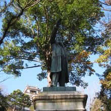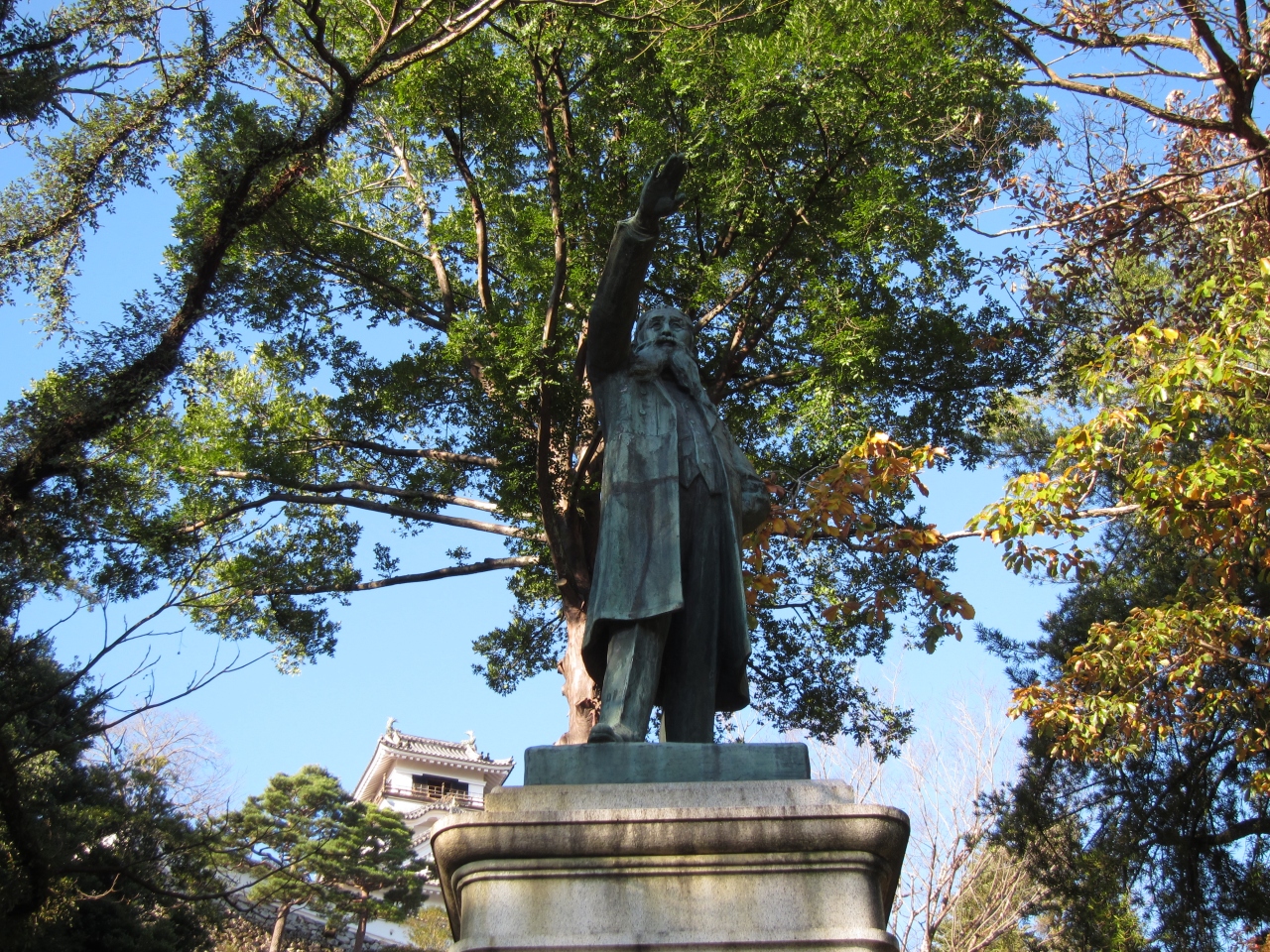 高知出身の有名人で自由民権運動を推進した、板垣退助の像が高知城の中にありました。追手門をくぐって石、段の手前の緑豊かな場所に立っています。「板垣死すとも 自由は死せず」の有名なセリフも、刻まれていました。