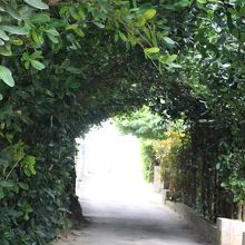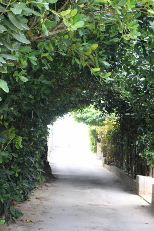 備瀬の「フクギ並木」をお散歩してみました。フクギは、沖縄では、古くから防風林として用いられ、特に海の近くにある村落の家の周辺には多く植えられたそうです。今でも、この備瀬地区にある住宅のほとんどは、繁茂したフクギに囲まれています。生い茂ったフクギ並木の道を歩いていると、聞こえるのは遠くに波の音とセミの声。なんだか懐かしい思いがしました。