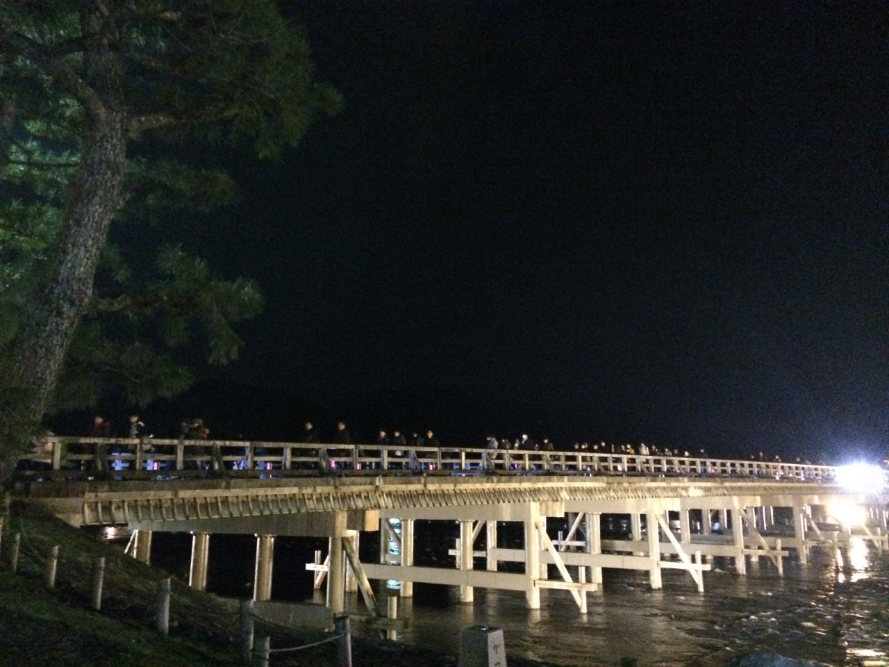 桂川にかかる渡月橋を臨む場所では最高の場所。トイレあり、ベンチあり、時期によっては屋台あり、そして市バスの停留所ありと至れり尽くせり。昼にいっても特にこの時期は市内よりも、寒さの厳しい嵐山地区でも、かなり寒く感じる場所なので、上着は常に持っていくことをおすすめします。