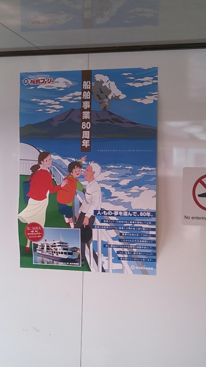 ちなみにこの桜島フェリー、昭和9年に開業したそうで、2015年11月現在、船舶事業80周年を迎えたそうです。2015年11月22日に乗船したところ、船内に「船舶事業80周年」の旨記されたパンフレットが貼られていました。