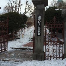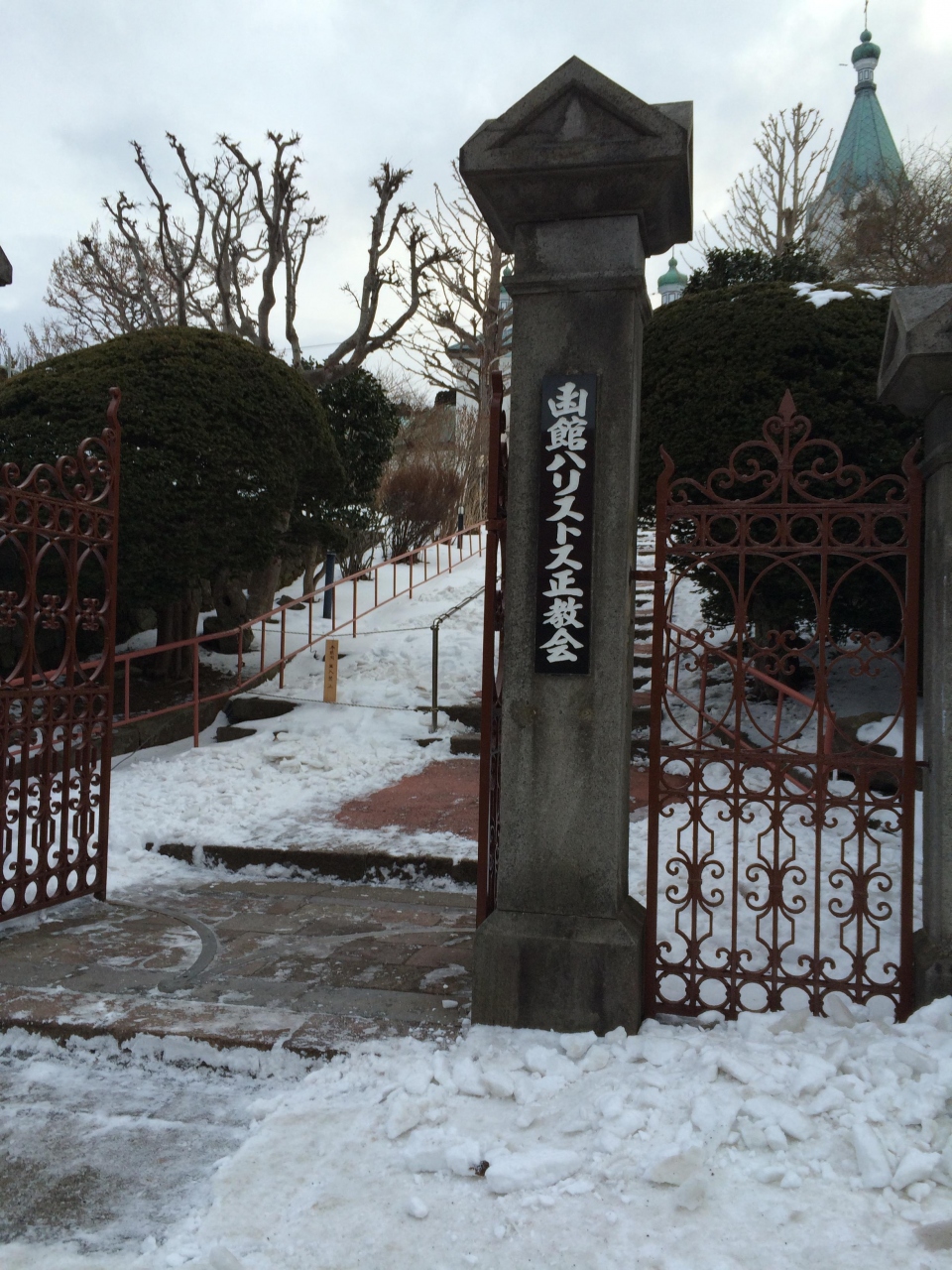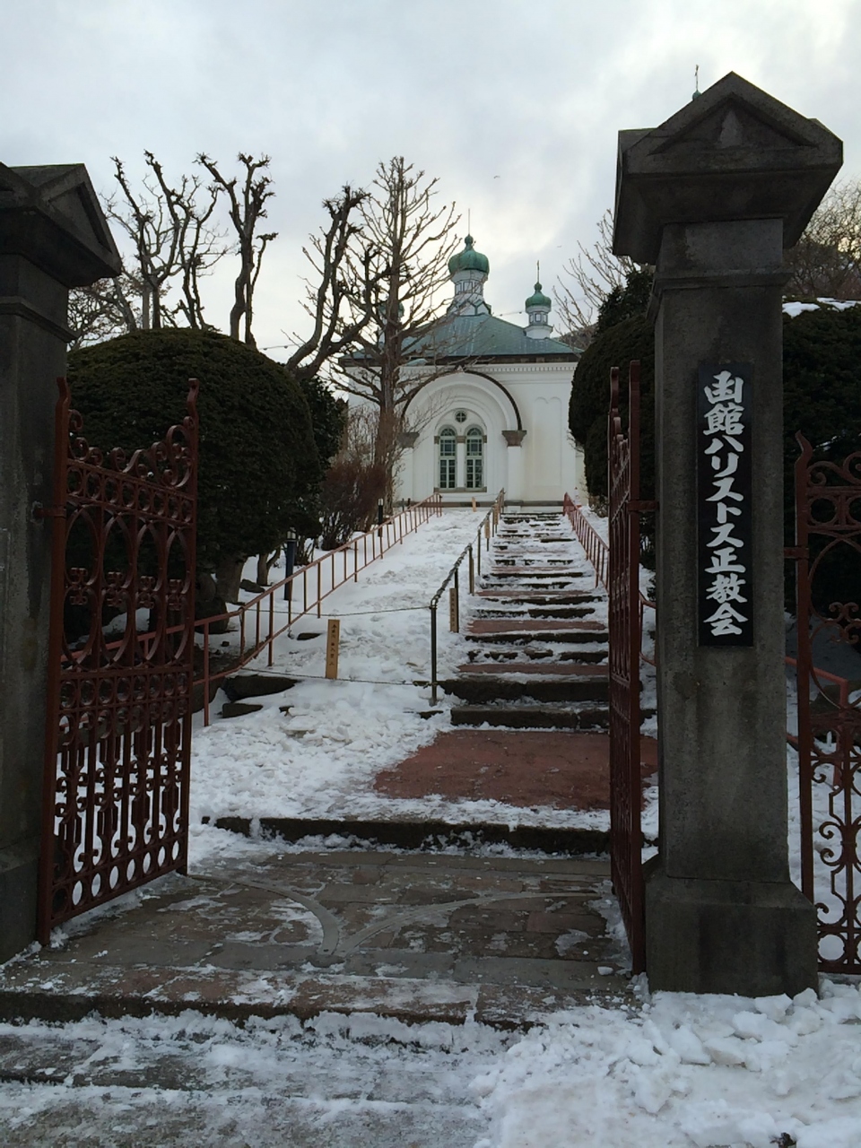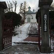 坂を下から昇って行って、ハリストス正教会 敷地の下方側に門柱があって、そこから階段を登っていく感じですが、雪の時期は慎重に登らないと足元が滑りそうです。外観は撮影が自由のようでした。教会敷地の上部側の道路から見下ろすと教会全体が可愛らしく見えます