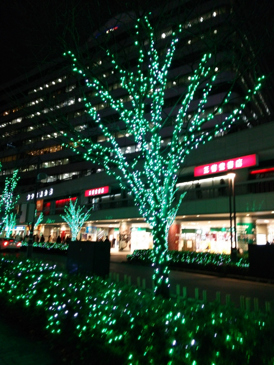 JR有楽町駅前(有楽町イトシア前広場)周辺の街路樹や植え込みなどに設置されたイルミネーションです。ここのイルミネーションは緑色一色の幻想的なもので、異空間にいるような感じがしました。また、東京交通会館などのイルミネーションもあり、周辺はかなり明るく輝いていました。