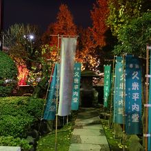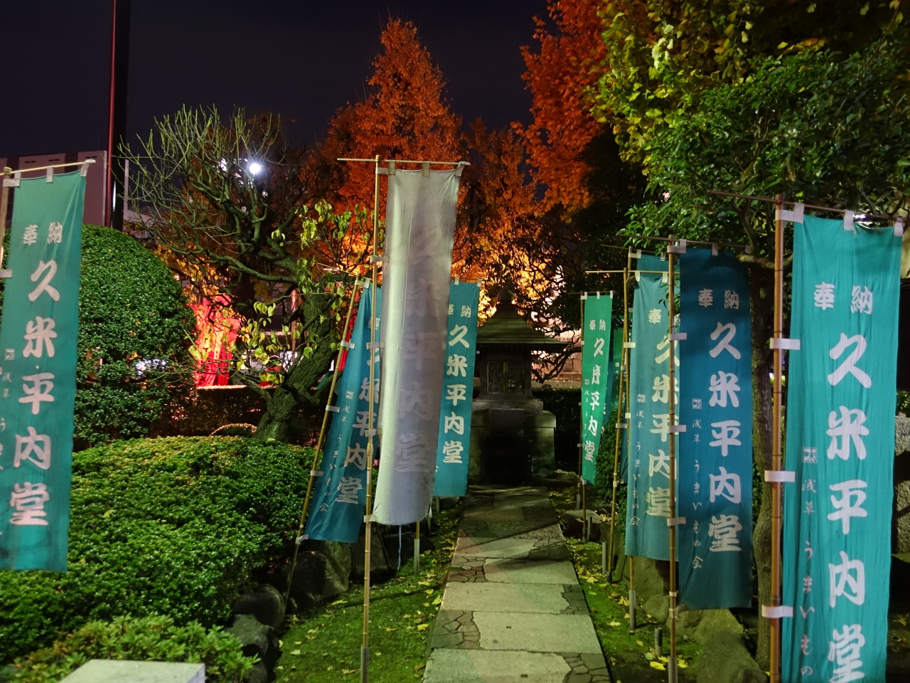 浅草寺の境内、本堂のすぐ近くにあるのが「久米平内堂」です。緑色の幟の奥にお堂がありますが、12月初旬という事で、背後に聳える樹木の紅葉が素晴らしく美しかったです。