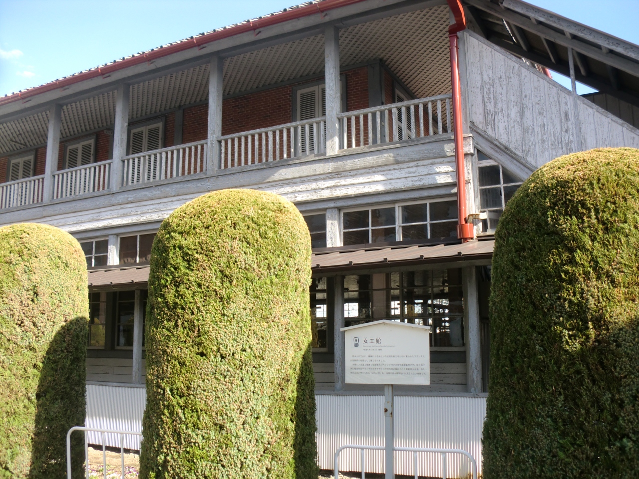東置繭倉庫から順路を追って奥に歩くと左手に見えるのが検査人館です。明治初期にフランスから招へいした技術者の宿舎だったそうですが、木造の建物で現存することが奇跡のようなことだと感心します。他にも女工館やブリュナ館など木造建築が多く残ります。