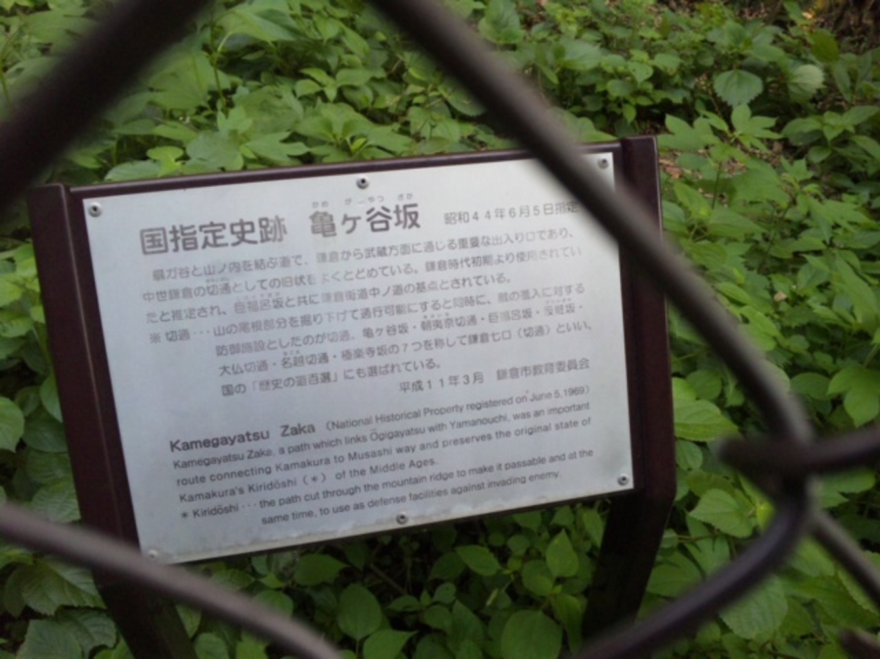 北鎌倉から建長寺方面に向かい、踏切を渡って少しいったところに右に入る道があるので、そこを入っていくと亀ヶ谷坂の切通があります。少し上りますが、すぐに下りになり、切通の坂になります。