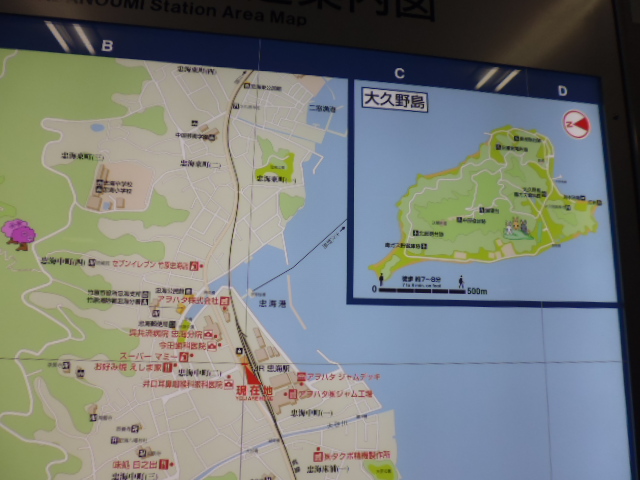 うさぎがいっぱいいる島として有名で、JR忠海駅から歩いてフェリーで行きます。駅には大きな看板もあってウサギ島である大久野島行きの人が大勢います。