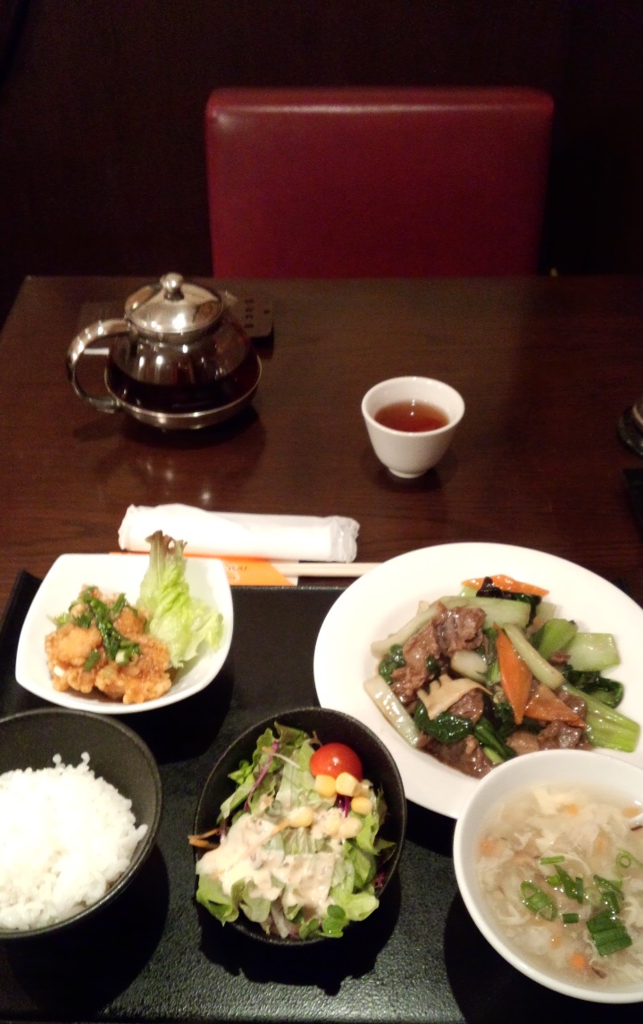 日替わりのようで、牛肉と野菜の炒めものと、鮭のソースがけ、スープ、サラダ、ご飯といった内容でした。