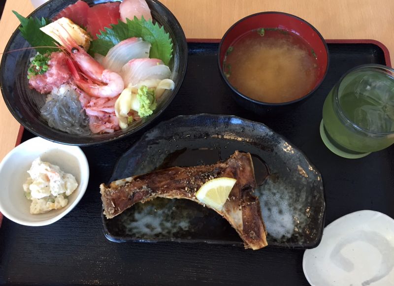 清水の「河岸の市」のまぐろ館という別館の2階にある店。どの料理にもマグロのカマがおまけで付いてくるということで有名らしい。つまり、カマ付の値段ってことですね。
