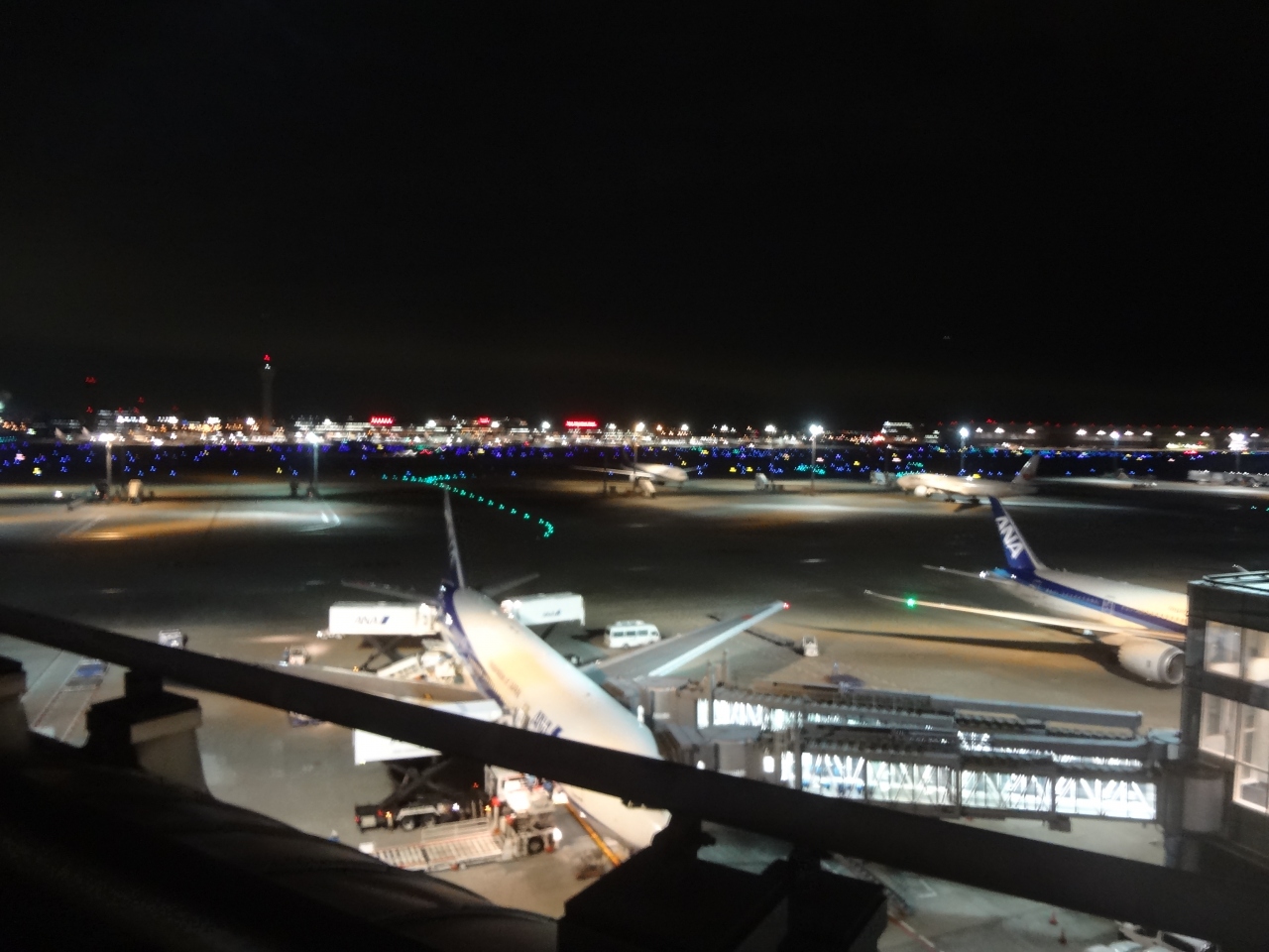 国際線の展望デッキです。ターミナルの5階にあり、中央のエスカレーターを上がった先、両サイドに広がっています。日中や夕方に何回か訪れたことはありますが、夜は初めてでした。反対側の国内線ターミナルの明かりや飛行機などライトアップがとてもきれいで、これはこれでとても良い眺めでした。