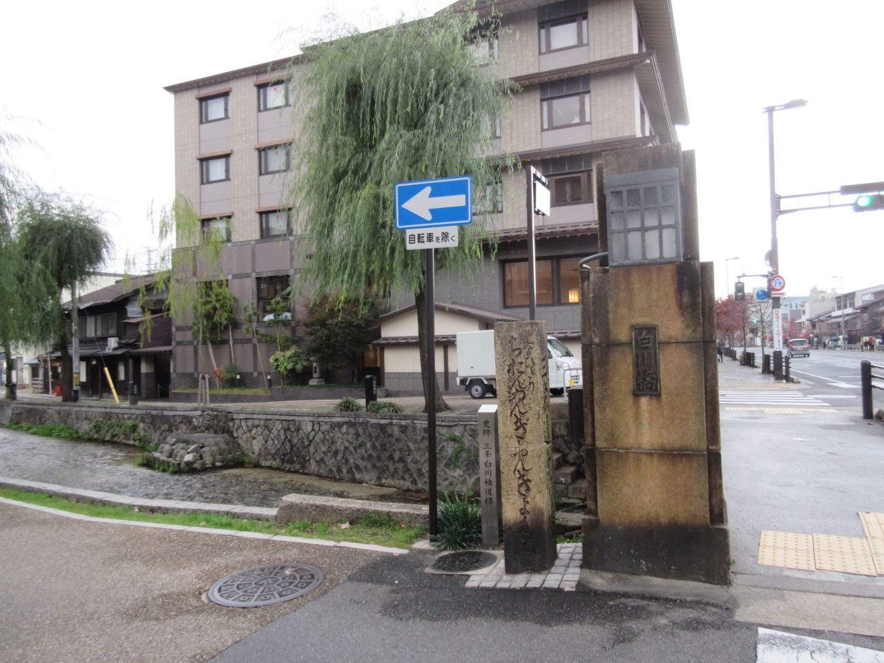 京都・三条通り、地下鉄東山駅や市バス東山三条から平安神宮へむかう途中にある普通の橋です。南側の歩道を行くと、知恩院に至る川沿いの道です。橋のたもとに、古い道標があります。「史跡三条白川橋道標」とありました。