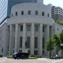 堺筋と土佐堀通りの交差点の北浜に楕円形と列柱による外観の独特の建築物です。長谷部鋭吉の設計による楕円形の旧市場館部と外壁・内壁の一部が保存されました。エントランスホールのステンドグラスはアールデコ様式で、近代日本のガラス工芸家生田徳次が製作、また床、壁とも大理石で仕上げられた壮麗な空間です。建物の正面には五代友厚の像がたっています。