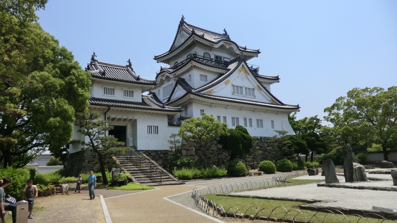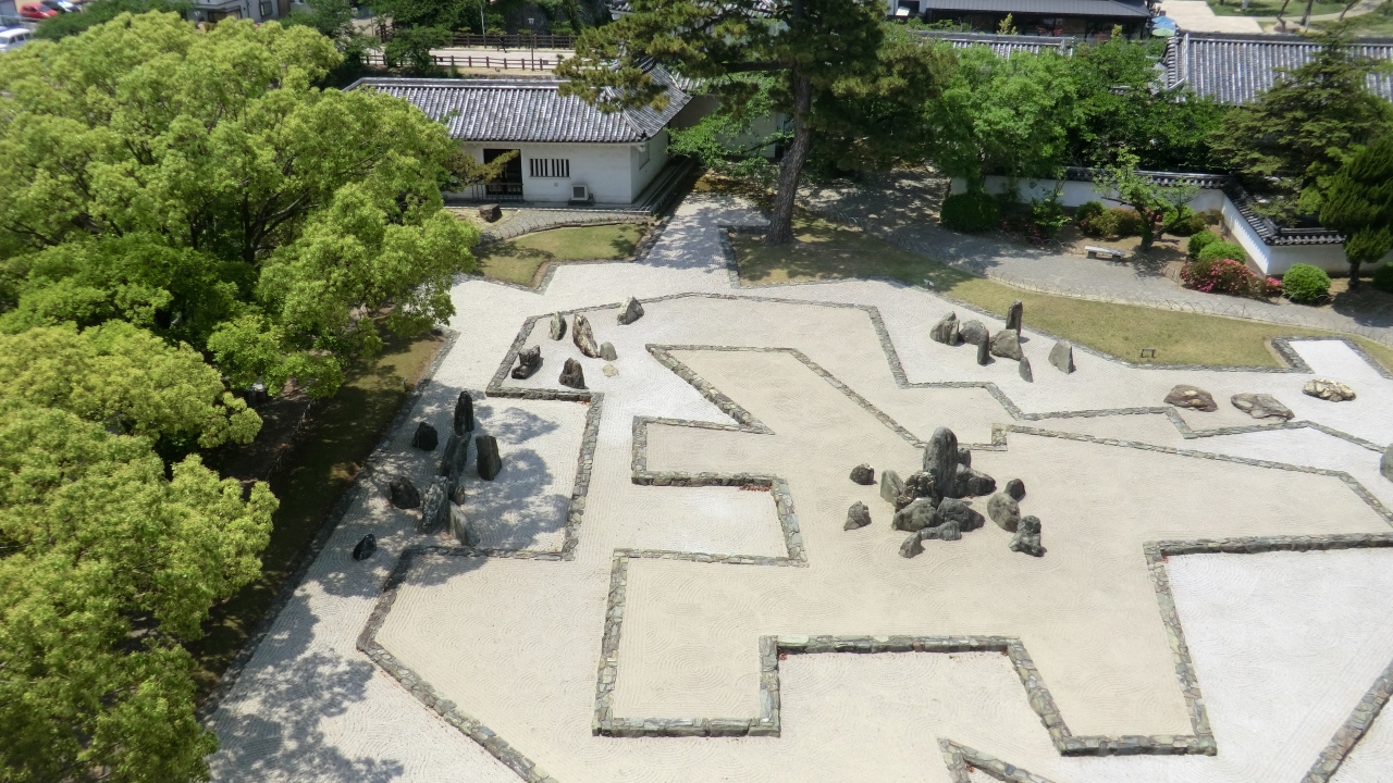 「岸和田だんじり祭り」で有名な岸和田の地にあります。南海本線「蛸地蔵」駅から徒歩5分。重森三玲氏の最高傑作と称されている「八陣の庭」を目当てに訪問しました。天守閣から見下ろすと、アーティスティックな構図に組まれた石庭が見事に俯瞰できました。重森三玲氏の斬新な作庭がここでも感じることができました。
