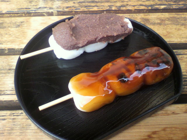 餡としょうゆを1本ずつ。すぐに食べる場合は、小さいお盆にのせてくれます。店頭にベンチがあるのでそこで頂きます。ひらべったいお団子が3つで1串です。餡はさらりとしていて食べやすい。しょうゆのほうはまだ温かくって、餡よりも柔らかい食感。かなり強めなしょうゆ味。美味しいおだんごでした!