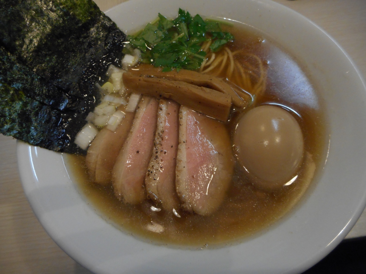 ラーメンは、「鴨」をテーマとして、スープは醤油・香味野菜・鶏とともにベースになっていて、味が良く出ていたし、チャーシューも贅沢にも鴨が使われていました。