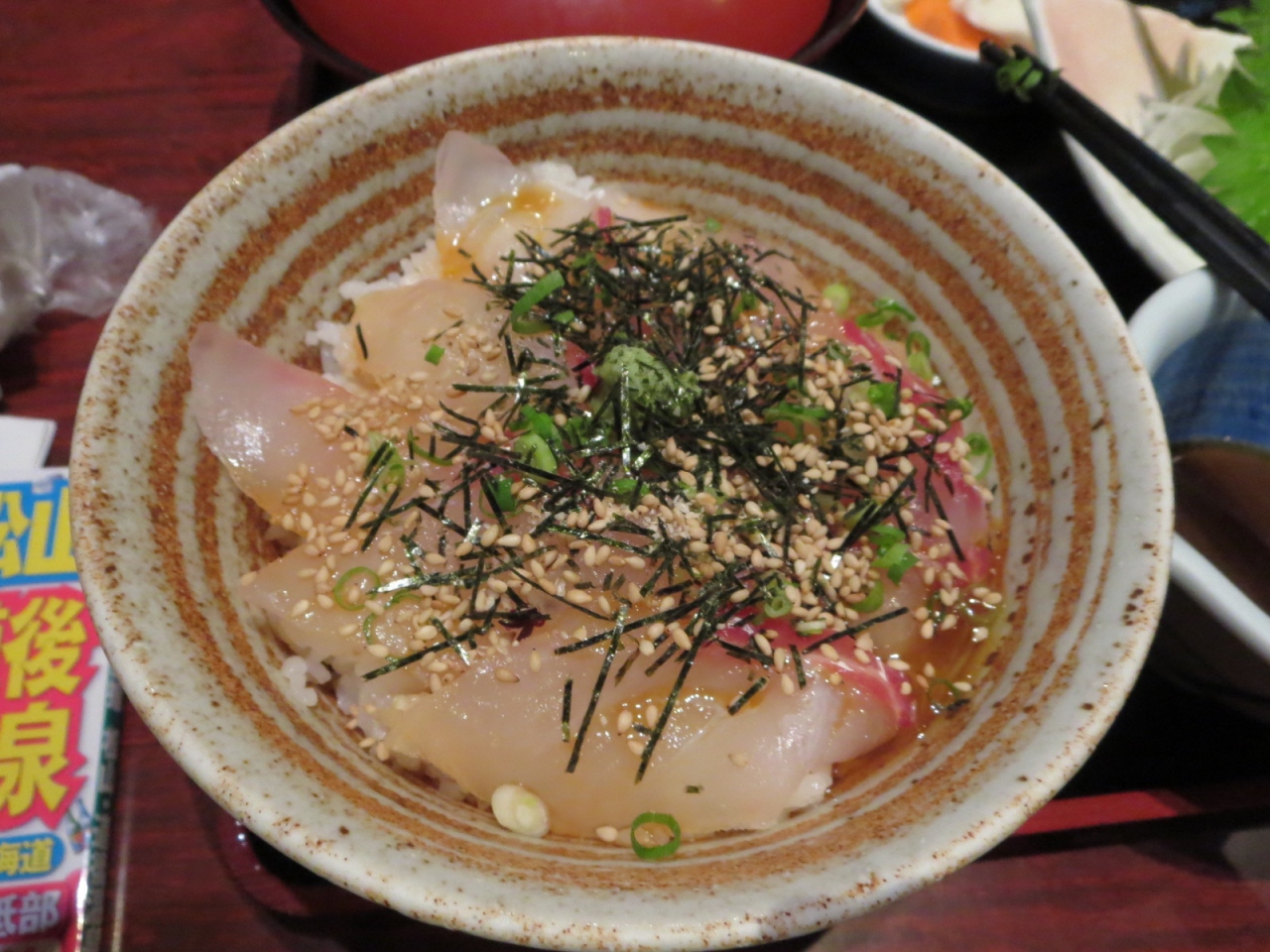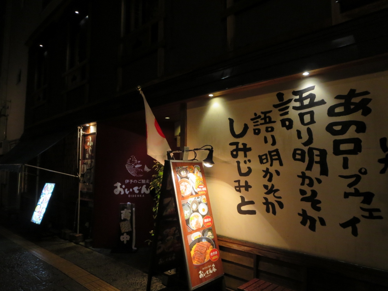 道後温泉本館の向かい、アーケード入口を背にして右側に少し進むとある郷土料理「おいでん家」。ガイドブックにも載っているので、観光客向きのお店かもしれません。メニューは郷土料理、特に海の幸を使ったものが多いです。あいにくの雨の日の休日の夜だったので空いていました。名物のじゃこ天、定番の出汁巻など1品400円未満で頼め、量も少なめなので一人利用にも便利。郷土料理のひとつ「鯛めし」目当てで入りましたが、空いていたからかもしれませんが、頼んでからの提供時間がとても早くてびっくりします。かといって出てきた料理は手抜きな感じでは決してありません。店員さんは若い人が多く、ちゃんと食べ方の説明もしてくれて親切でした。