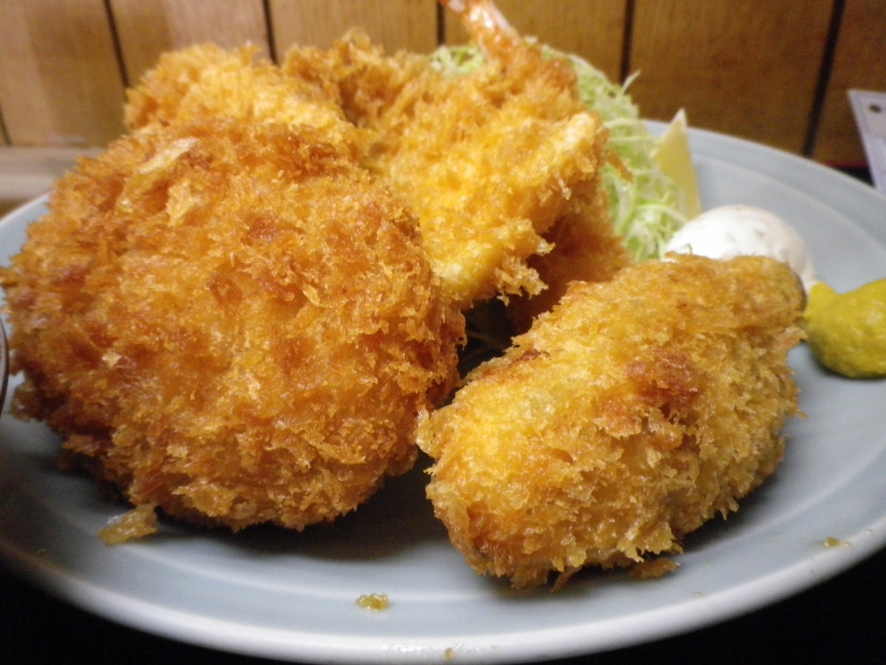 1年ぶりに訪問すると、さすがに値上げが行われていた。客の回転が悪くなったのだろうか、入口付近にあったマンガの棚も撤去されていた。盛合せフライの内容は、エビ、イカ、カジキ、カキ、コロッケの五種。エビとコロッケは常連だがその他はその時で変わる。