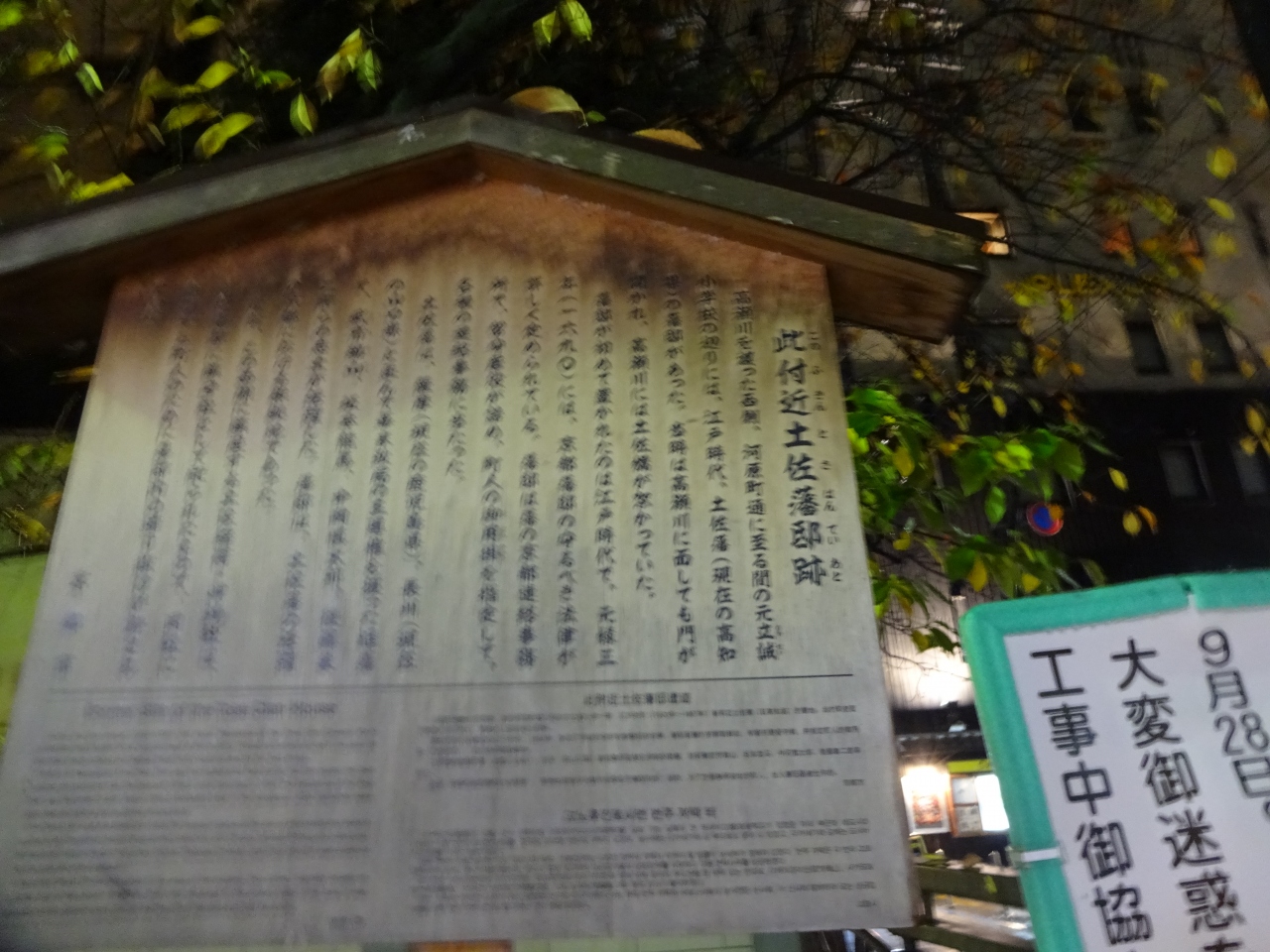 夕食後に散策を続けていたら、高瀬川沿いに案内の札を見つけた。
