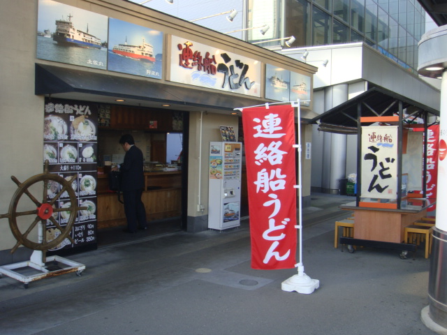 JR高松駅構内にある立ち食いうどんのお店です。名前から察すると宇高連絡船があったころから営業しているのではないでしょうか?ぶっかけうどんが300円、肉うどんが450円で相場並みです。麺は食べ応えのある太麺で麺で、ネギとしょうがと醤油をかき混ぜていただきます。甘味のあるぶっかけ醤油としょうがの辛みがいい塩梅です。発車ギリギリまで讃岐うどんを食べられるのはうれしいです。