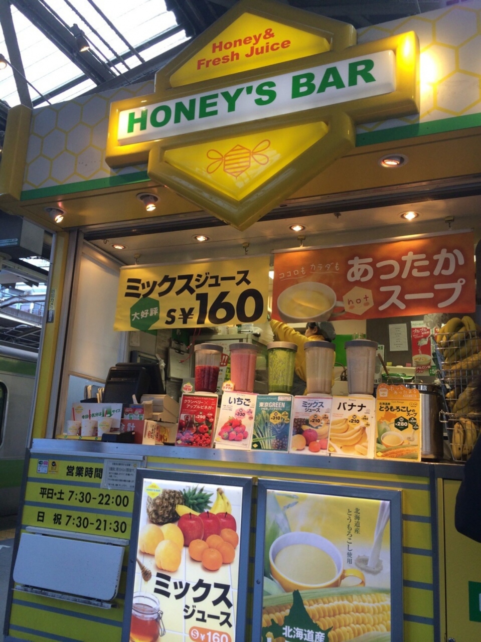 新宿駅ホームにあるハニーズバーです。フレッシュフルーツジュースや冬場はコーンスープなどが飲めるテイクアウト専門です。フルーツジュースなどは結構飲みごたえがあるので、買い物帰りや会社帰りのちょっと小腹が空いた時にちょうどいいです。