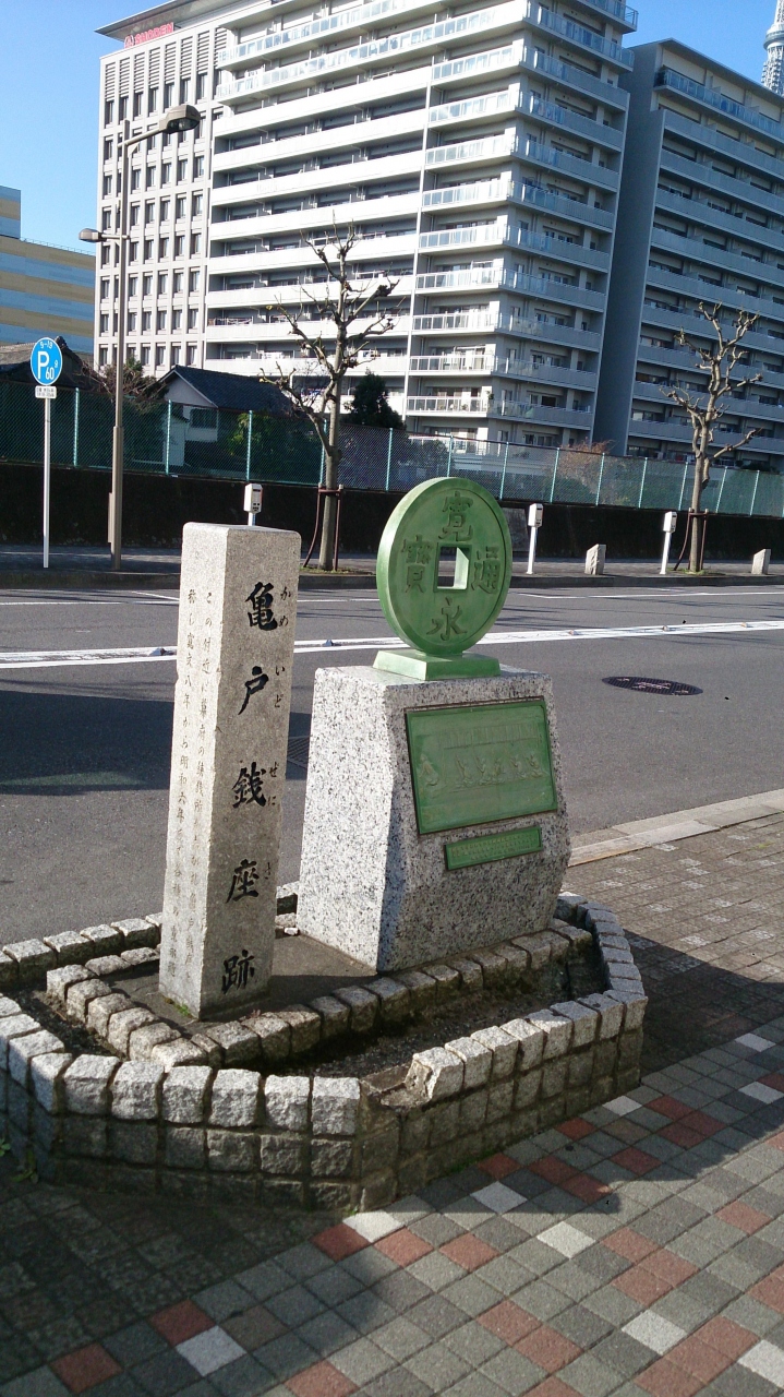 亀戸と錦糸町のちょうど真ん中あたりにある川沿いの道路沿いにあります。すぐ近くには亀戸天神やくずもちの船橋屋があって、亀戸のスポットが集まった場所にあります。最寄り駅は亀戸と錦糸町ですが、地下鉄半蔵門線の錦糸町駅が一番近いと思います。この地には江戸時代のお金の寛永通宝のブロンズ像が石の台座に乗っています。すぐわきには石標があって、亀戸銭座跡と記されていて、目立っているのですぐに分かります。この碑自体は由来になっているものをデザインした碑で良く見かける標準的なものだと思います。ここを主目的で訪問するというよりは、周辺スポットを散策する際に立ち寄る感じの場所だと思います。
