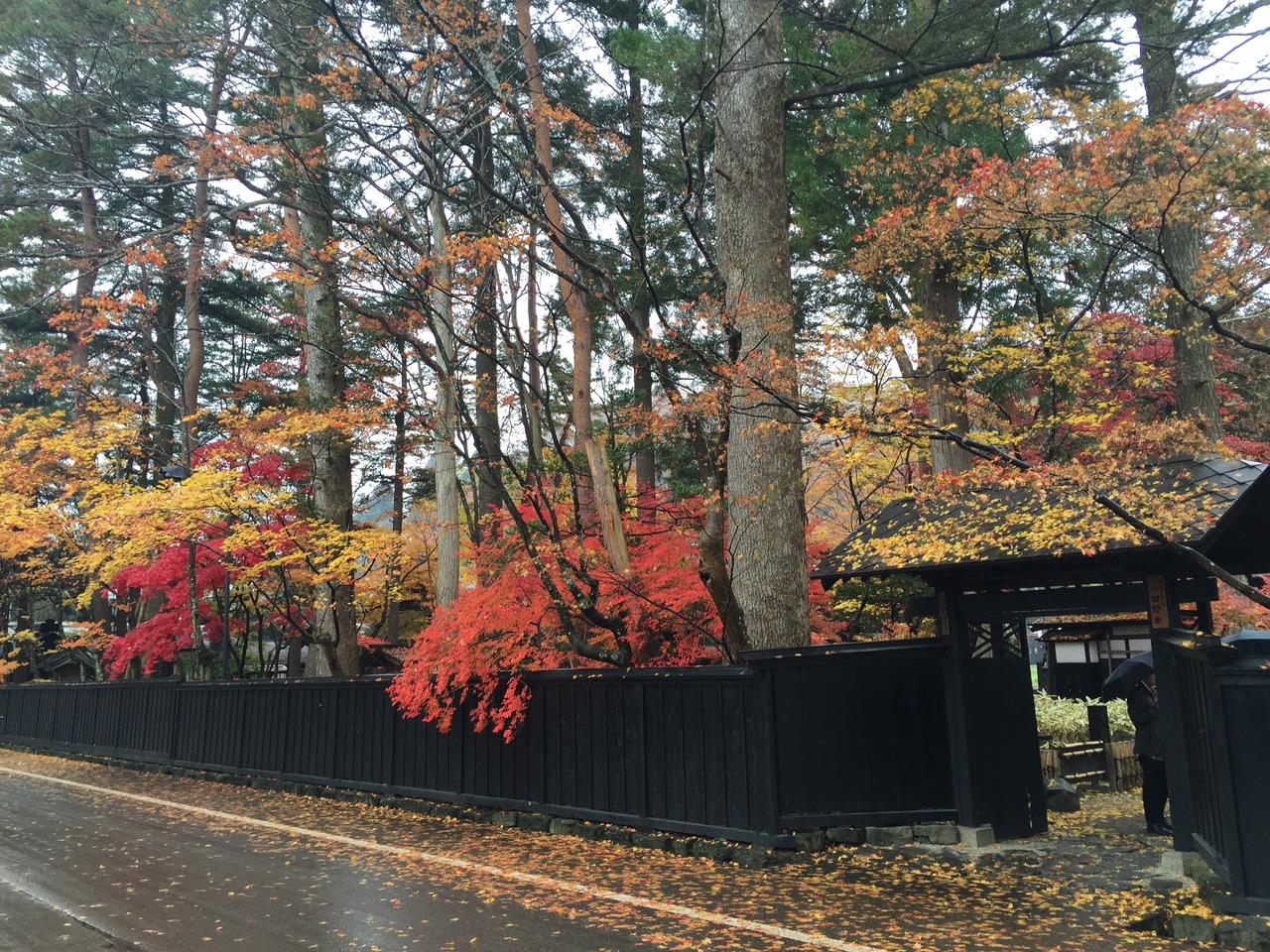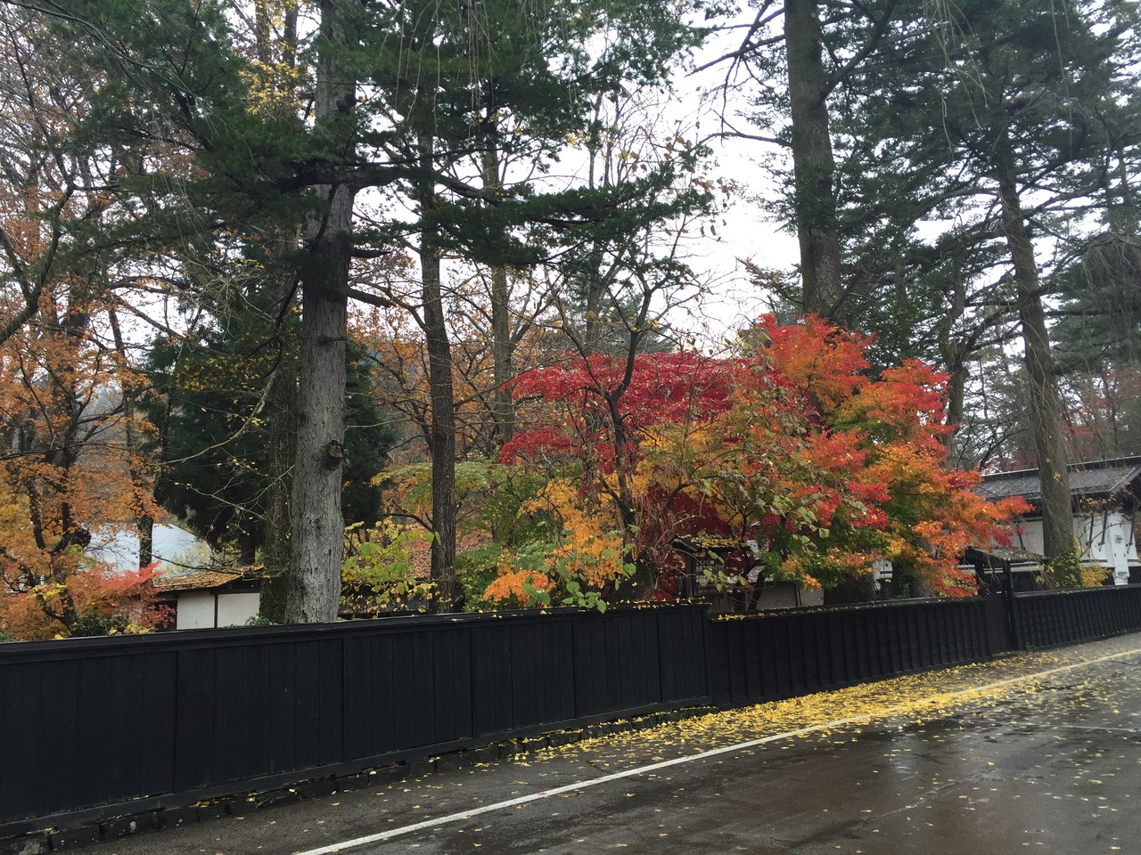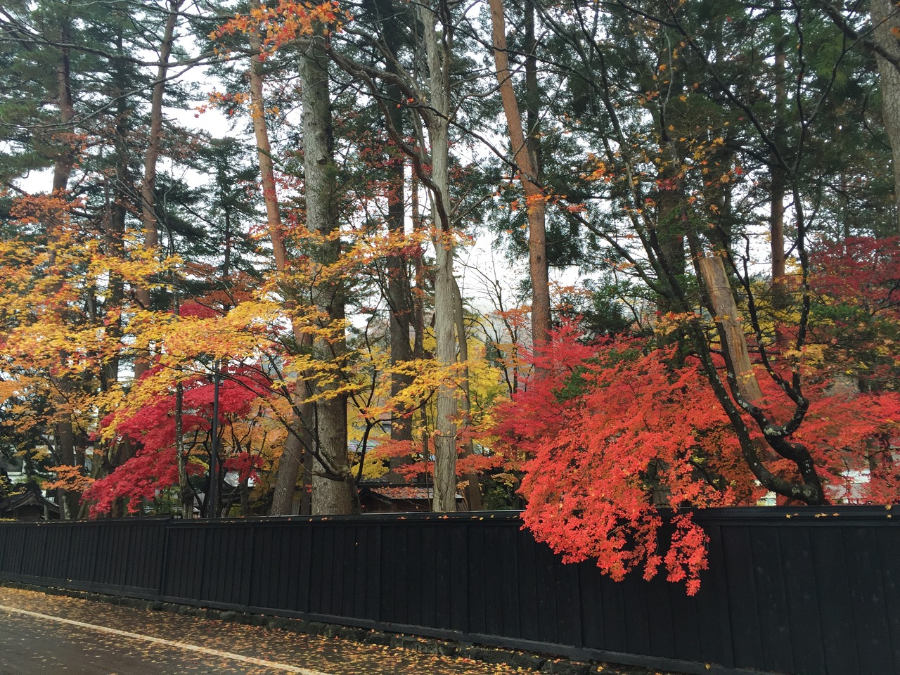 ここ東北 角館の紅葉は 鮮やかな黄色 赤と素晴らしく 黒塀にとても映えていた。