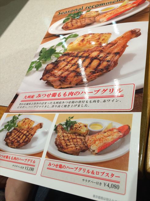 シズラーでのおすすめは、九州産みつせ鶏もも肉のハーブグリルですね。ほどよい歯ごたえと豊かな風味が楽しめる「みつせ鶏」です。期間限定ですが、「骨付きもも肉」は、赤ワインで煮込んでいます。ぜひ、一度、食べにいってみてください。