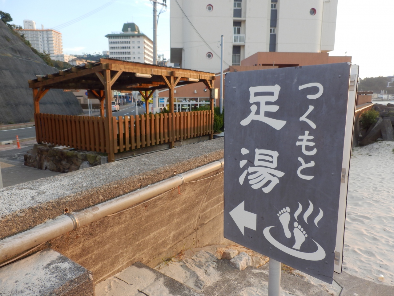白良浜海岸の海に向かって左側にあります。ホテル三楽荘の向かい側といったところです。看板はありますが、手ぬぐい・タオルはありません。係の方もいません。足湯に入るのは無料です。海岸で付いた砂をここで洗わないように注意看板版がありました。