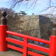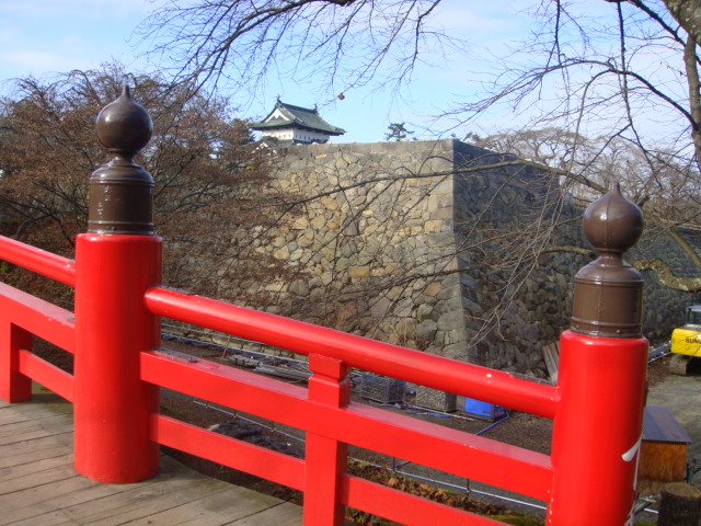 「げじょうばし」と読みます。本丸と二の丸に架かる橋で、馬でこの橋を渡れるのは藩主のみで、二の丸側には下馬札が置かれ、藩士は馬から降りるよう定められていました。以前は下乗橋から弘前城が見渡せましたが、現在は曳屋工事のため後ろへ退き、天守閣の上の部分しか見えません。ただこのアングルも長い歴史の中では貴重なものになりそうです。