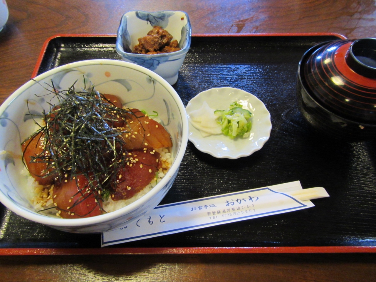 看板には「くじら料理」と大きく書いてあるが、もう一つ名物でありそうなまぐろ丼を注文した。漬けにした大ぶりのマグロブツ切りがご飯に乗っていて860円。