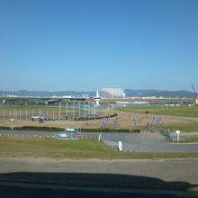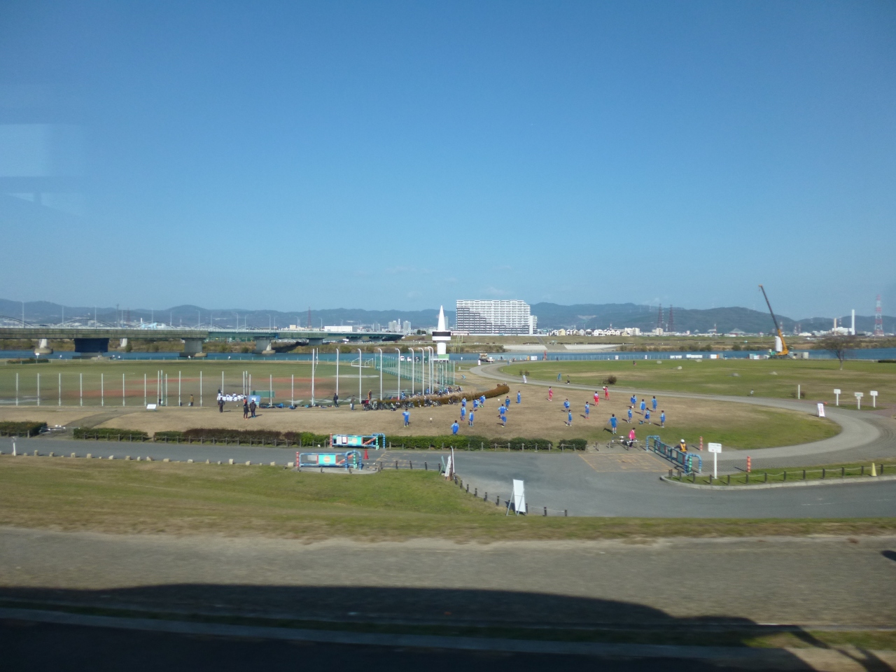 淀川の河川敷にはいくつもの公園が設置されていますが、枚方市内には特に多く、運動場なども整備されています。淀川、そして遠くには山の姿も見られる景色は素晴らしく、スポーツをする子供たちから子連れの家族まで数多くの人でにぎわいを見せていました。