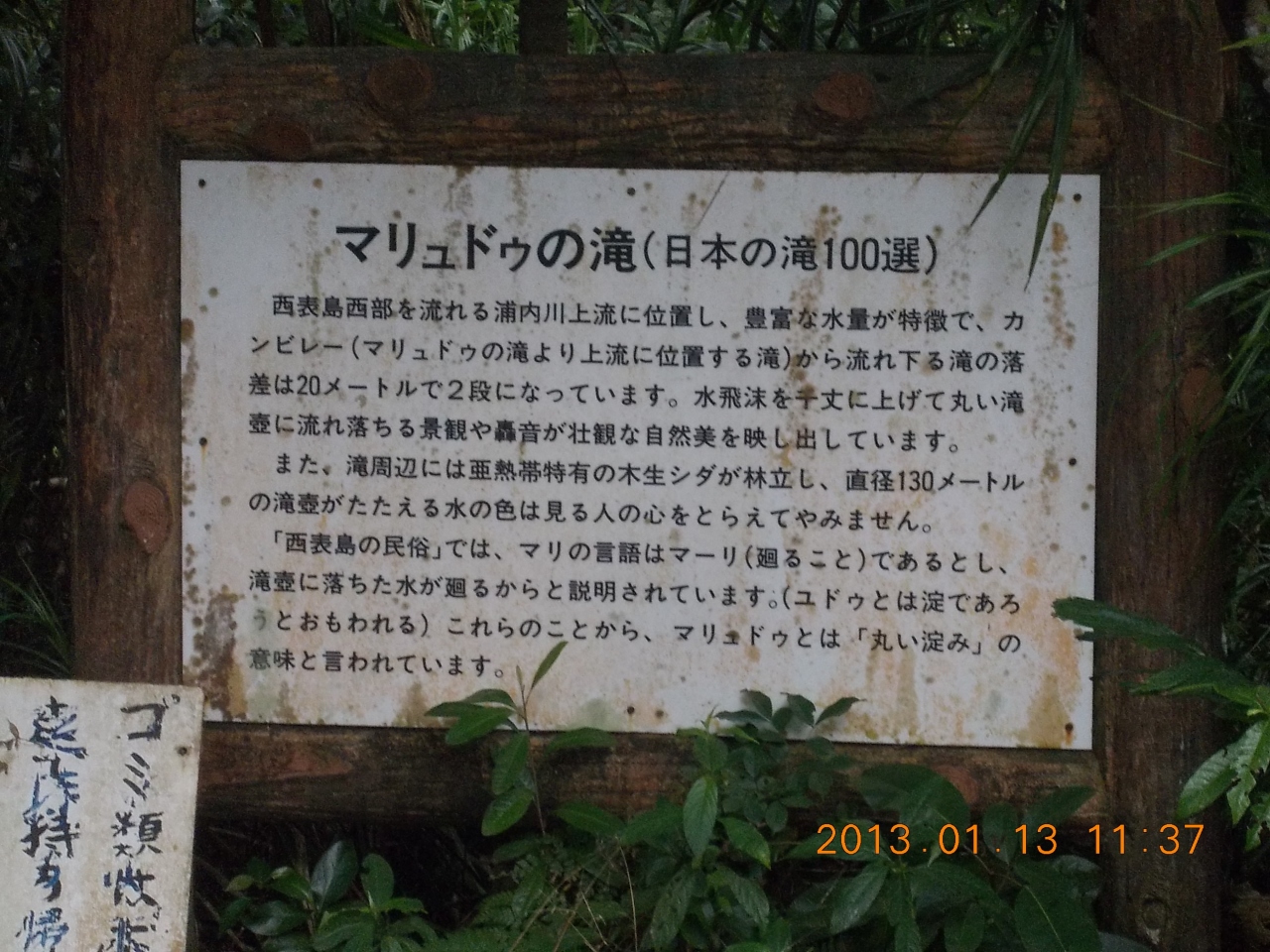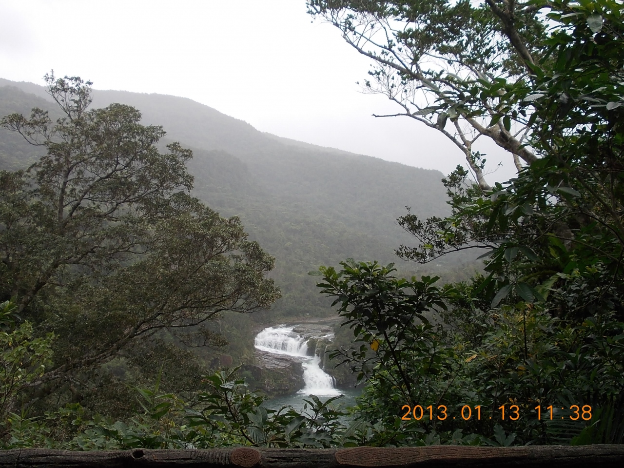 浦内川のクルーズに乗り、終点で降りた後、片道1時間程度のハイキングをした。途中で雨が強まってくるなかであったが、登山道は整備されており、濡れていたためすべりやすいものの、歩きやすかった。1時間程度歩いていくと、山の上の展望台に着く。マリュード滝は、その展望台から眺めるだけである。展望台から登山道をさらに進むと、マリュード滝の近くまで降りていく道があったが、柵があり通行止めであった。是非、近くで見たいので、整備してほしいところである。