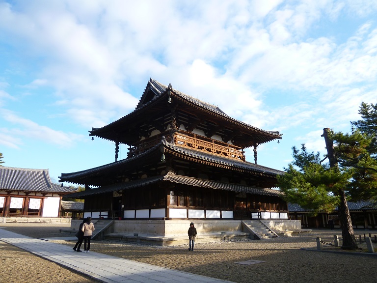 法隆寺を代表する建築の一つで、国宝に指定されています。7世紀の飛鳥文化の粋を結集した美しい建築で、中央が少し膨らんだエンタシスの柱も、一層と二層の均整もとれた傑作です。堂内にはアルカイック・スマイルをたたえた国宝の釈迦三尊像がご安置されており、静謐で厳かな空気が流れています。