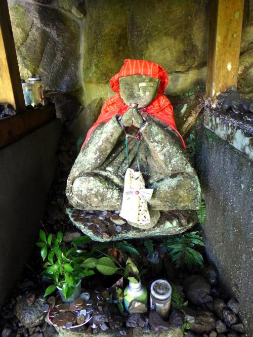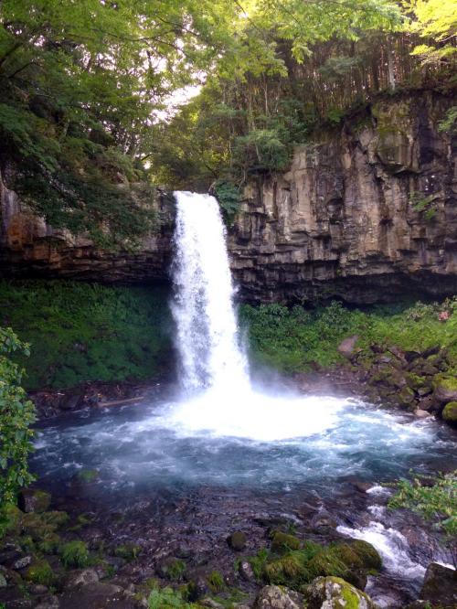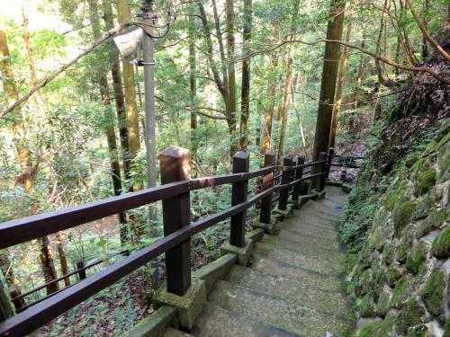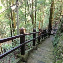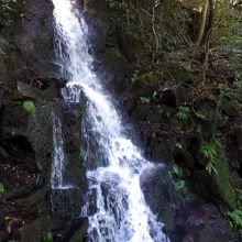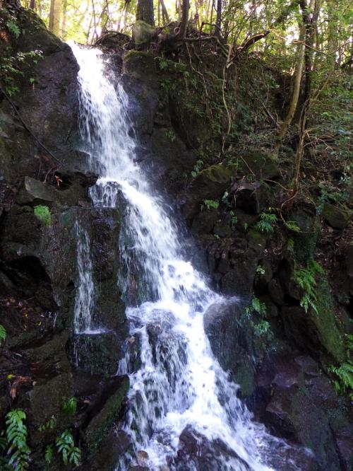 けっこう急な階段を下った先には小滝があって、下り切ると万城の滝があります。