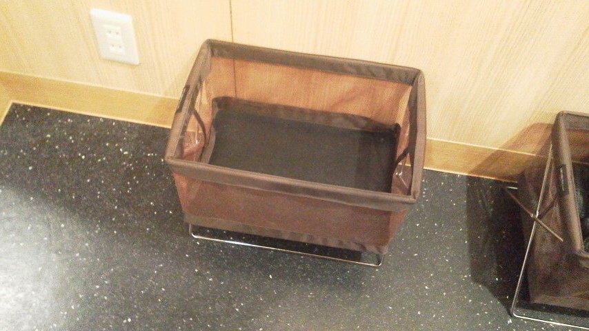 各席後方には荷物置きか゛有ります。また、紙エプロンも言えば出てきます。